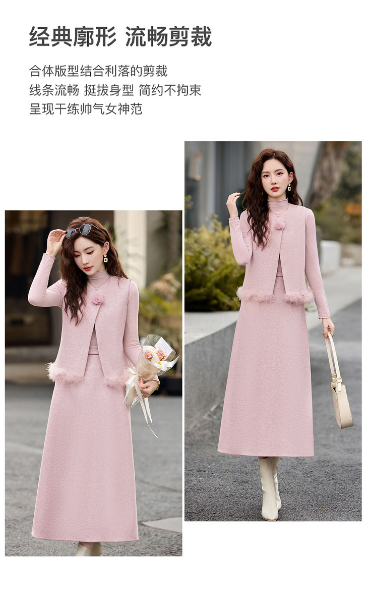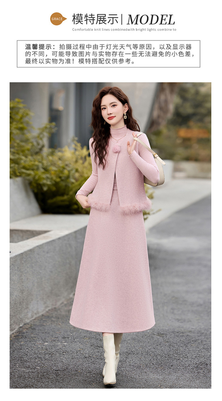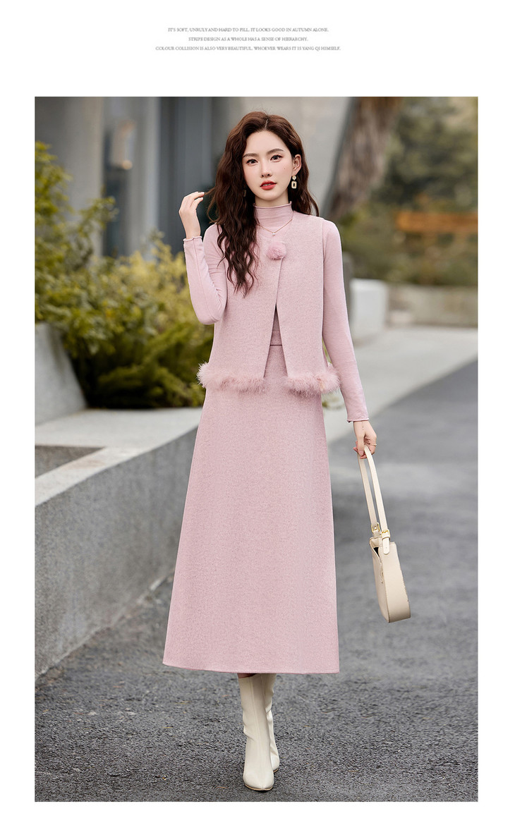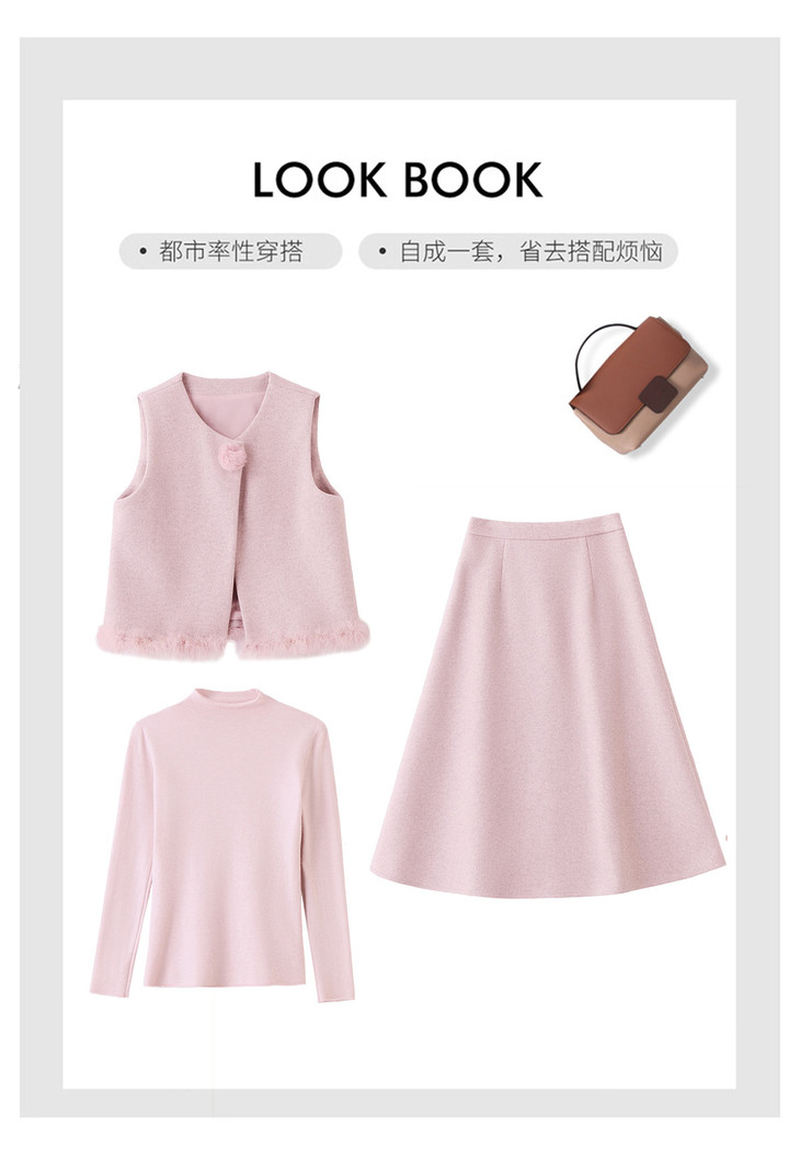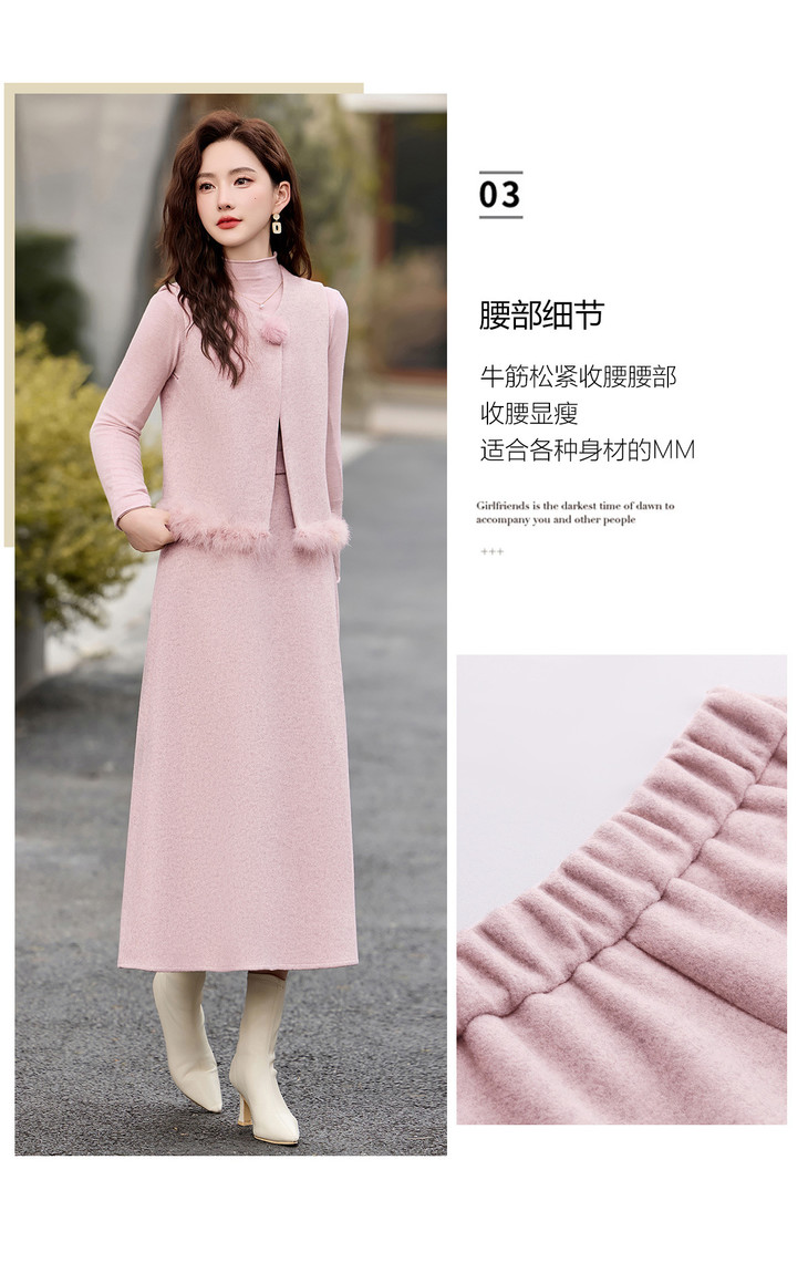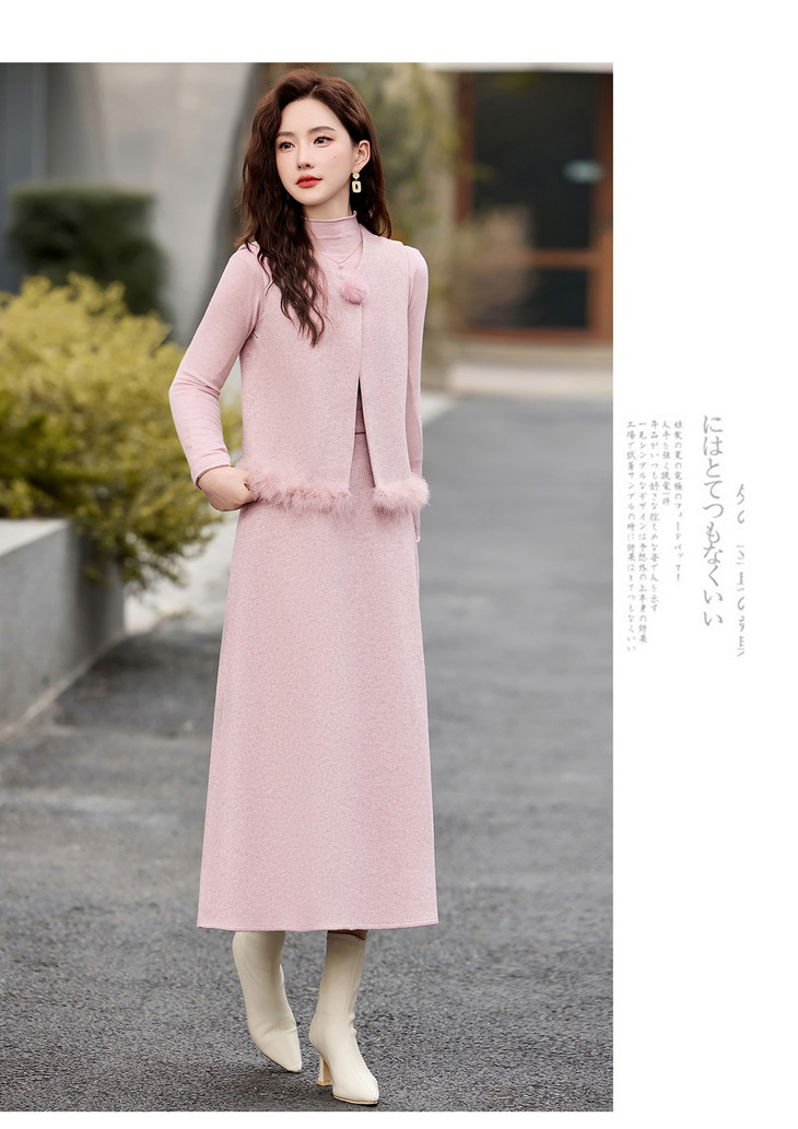 韩系粉色鸵鸟毛拼接马甲,内搭半身裙三件套HR-XXM113 商品图4
