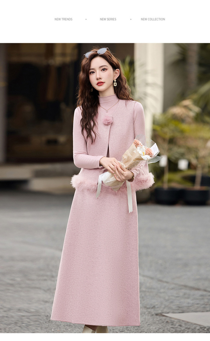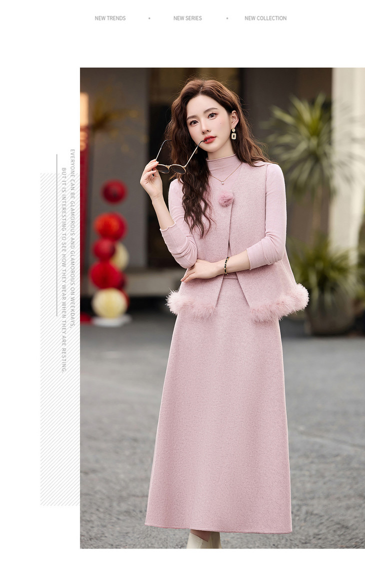 韩系粉色鸵鸟毛拼接马甲,内搭半身裙三件套HR-XXM113