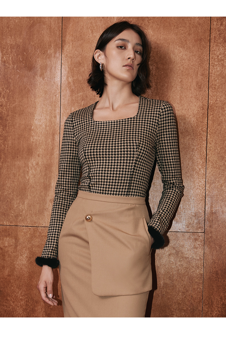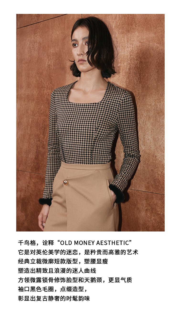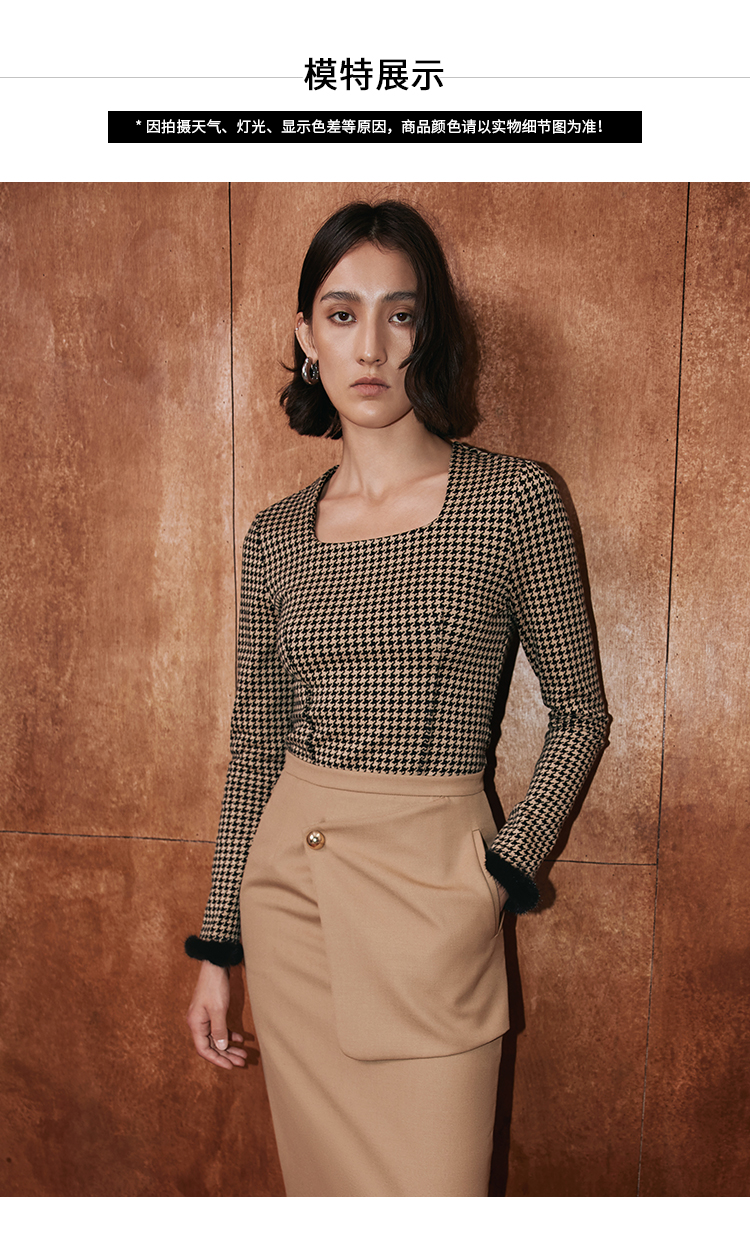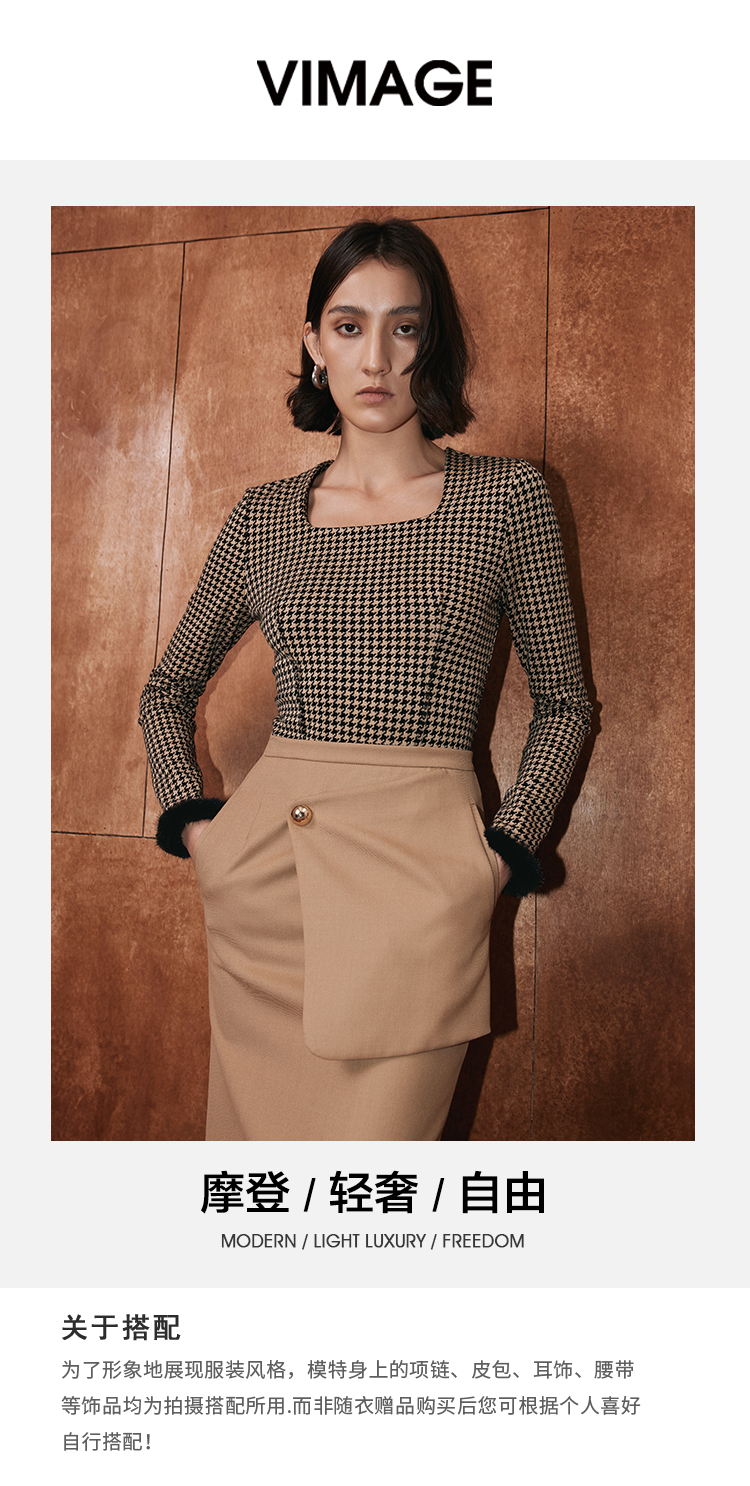 VIMAGE纬漫纪冬季新款时尚修身方领格子百搭上衣V2013617