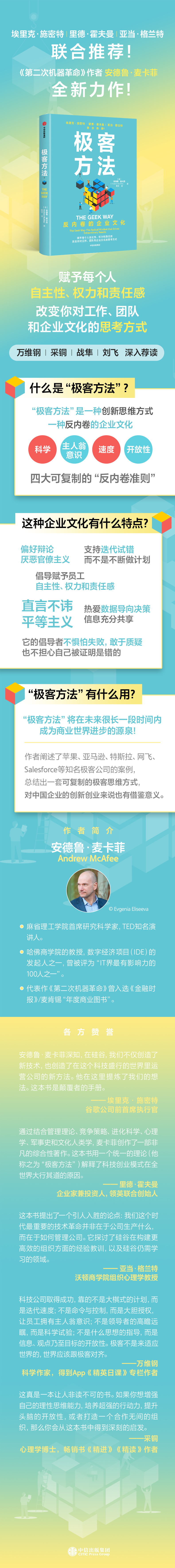 科技公司取得成功,靠的不是大棋式的计划,而是迭代速度;不是命令与控制,而是大胆授权,让员工拥有主人翁意识;不是领导者的高瞻远瞩,而是科学试验;不是什么思想的指导,而是信息、观点乃至目标的开放性。麦卡菲讲出了为什么极客文化是硅谷的真正优势,为什么极客都是这个时代酷的人。极客不是来适应世界的,世界应该跟极客对齐。