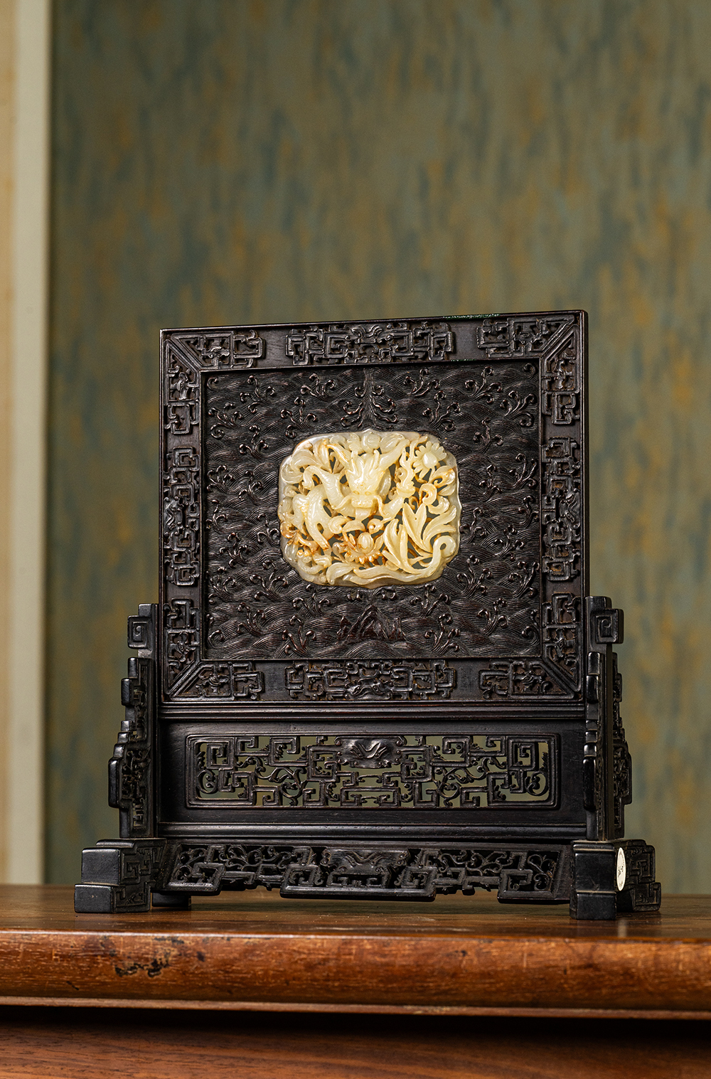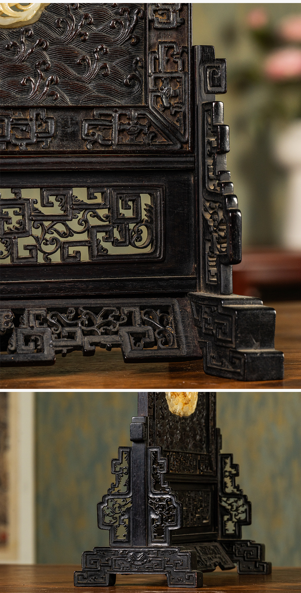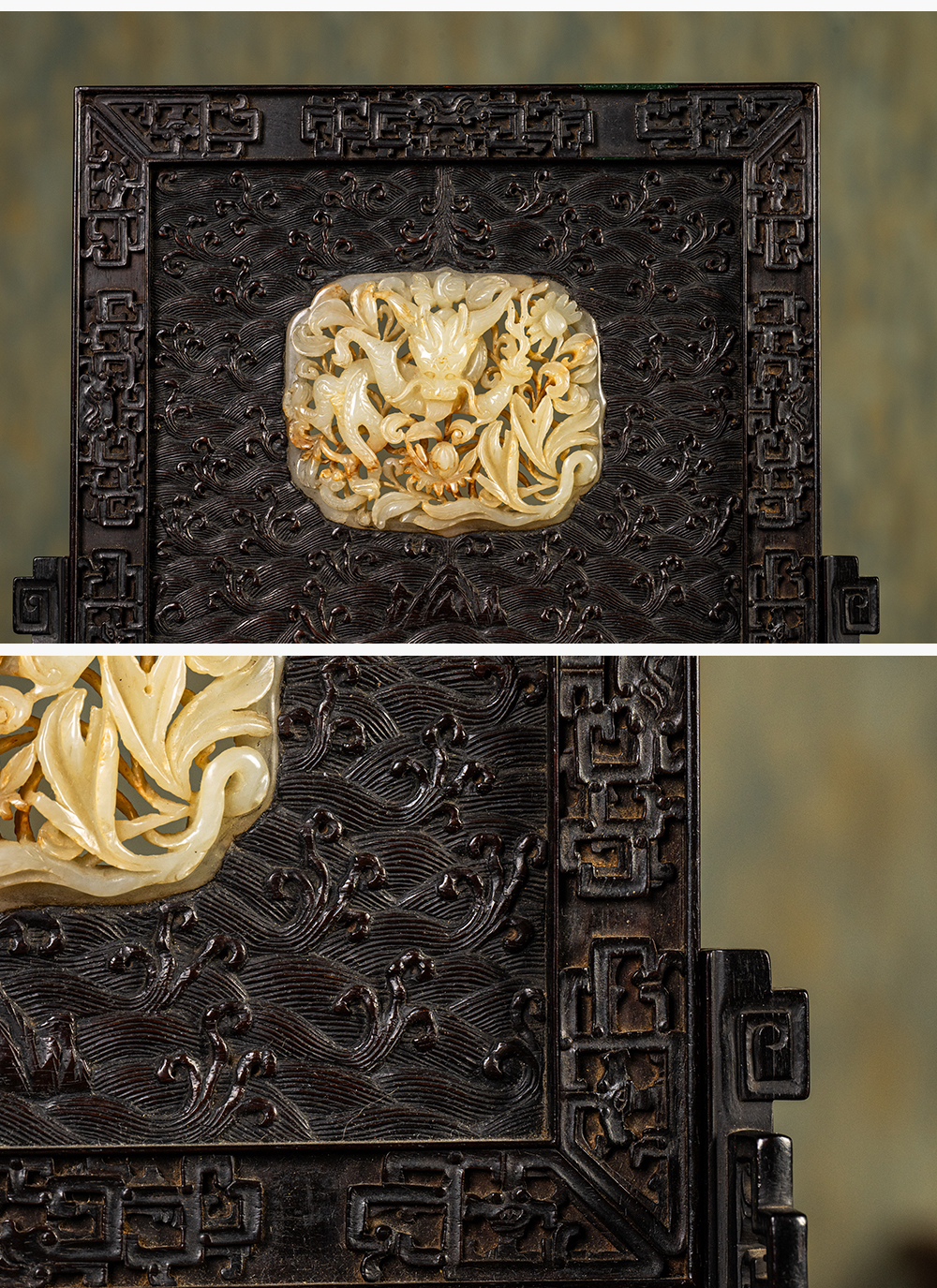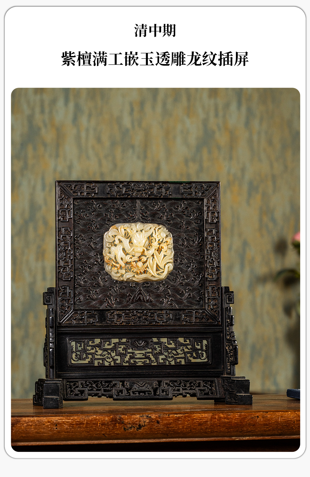 清中期 紫檀满工嵌玉透雕龙纹插屏