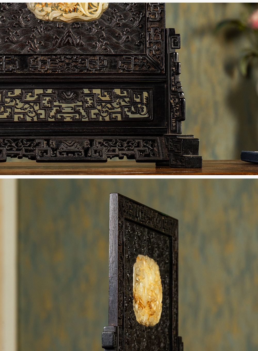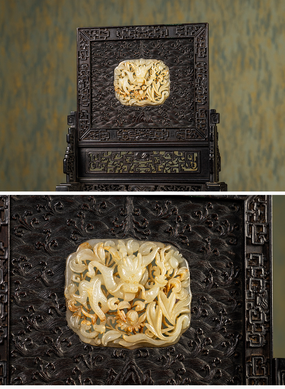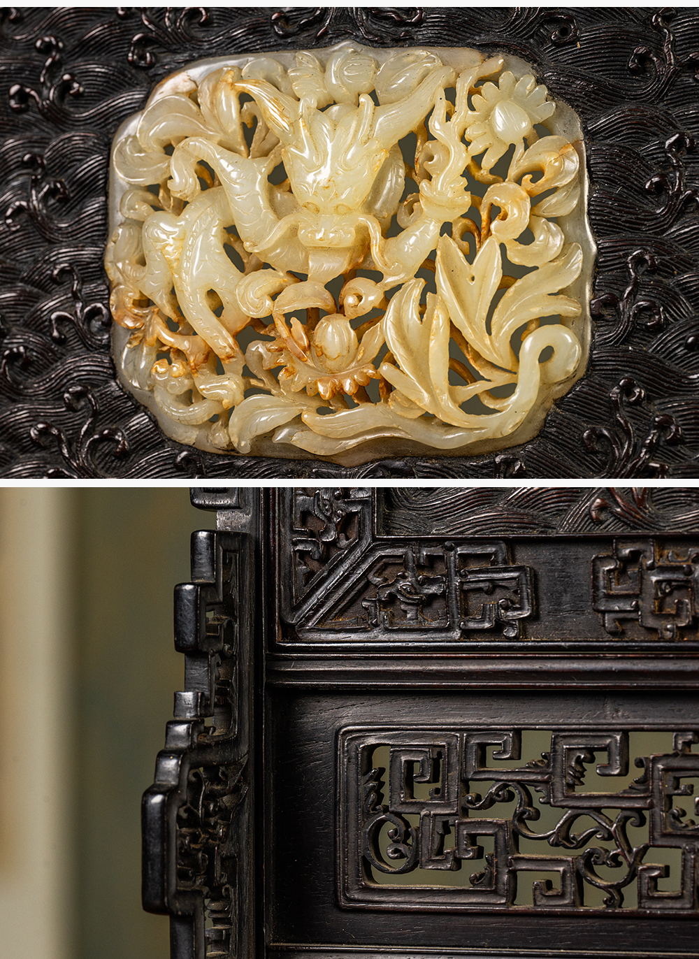 清中期 紫檀满工嵌玉透雕龙纹插屏