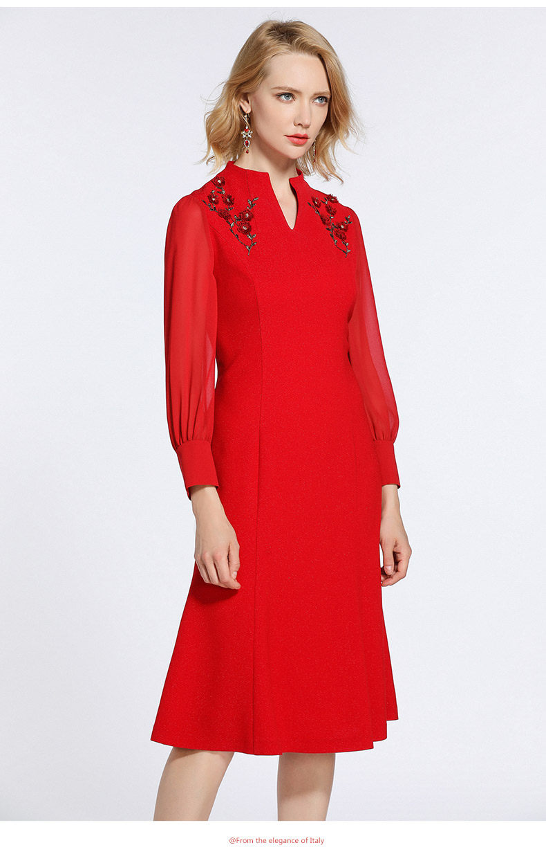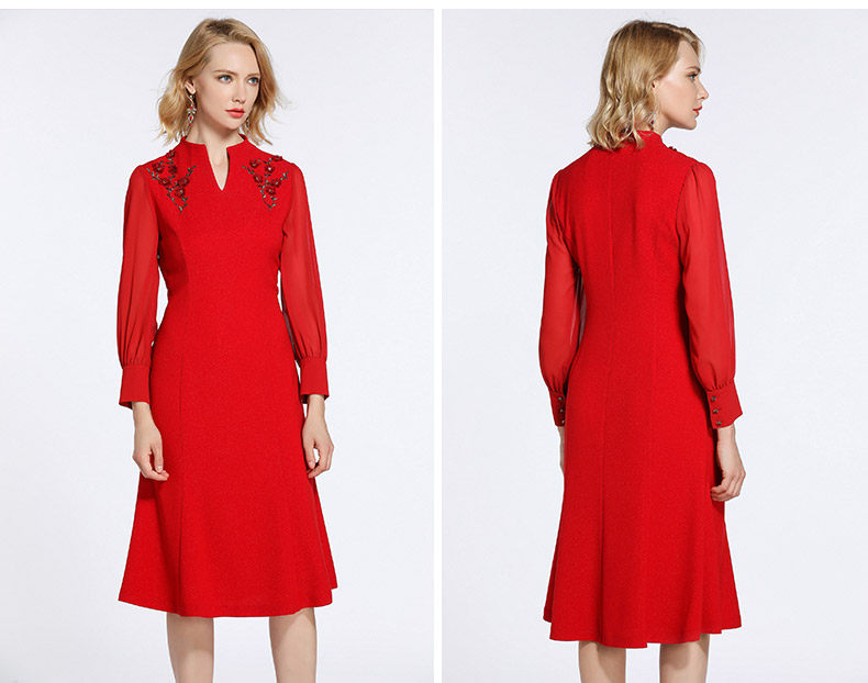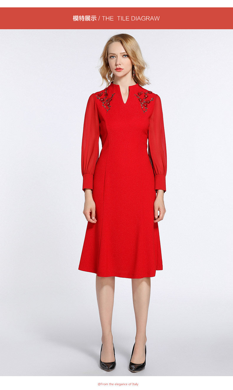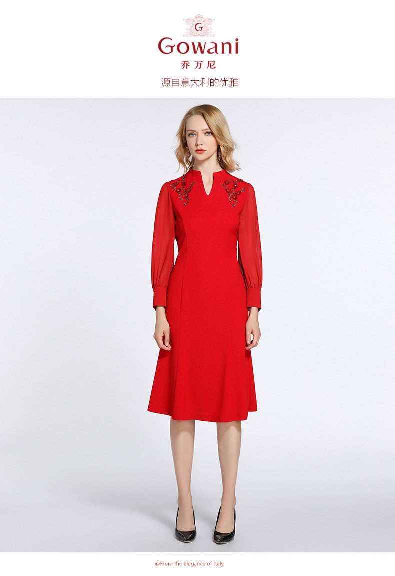 乔万尼春装女春季半高v领修身红色典雅喜宴长袖连衣裙EB3E236