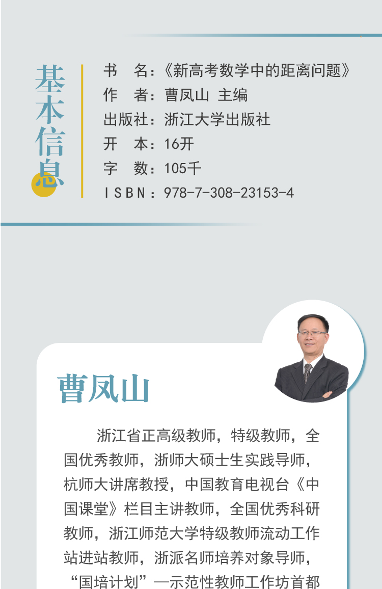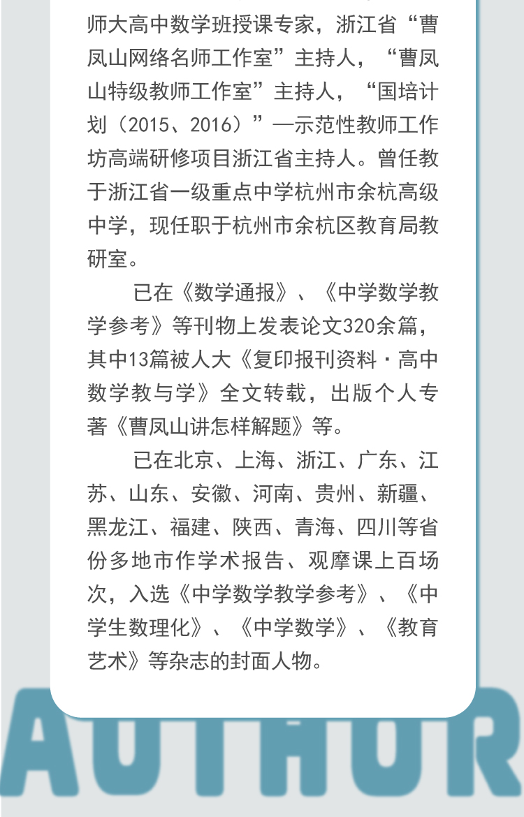 曹凤山,浙江省正高级教师,特级教师,全国优秀教师,浙师大硕士生实践导师,杭师大讲席教授,中国教育电视台《中国课堂》栏目主讲教师,全国优秀科研教师,浙江师范大学特级教师流动工作站进站教师,浙派名师培养对象导师,“国培计划”—示范性教师工作坊首都师大高中数学班授课专家,浙江省“曹凤山网络名师工作室”主持人,“曹凤山特级教师工作室”主持人,“国培计划(2015、2016)”—示范性教师工作坊高端研修项目浙江省主持人。曾任教于浙江省一级重点中学杭州市余杭高级中学,现任职于杭州市余杭区教育局教研室。
