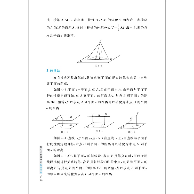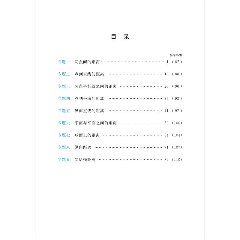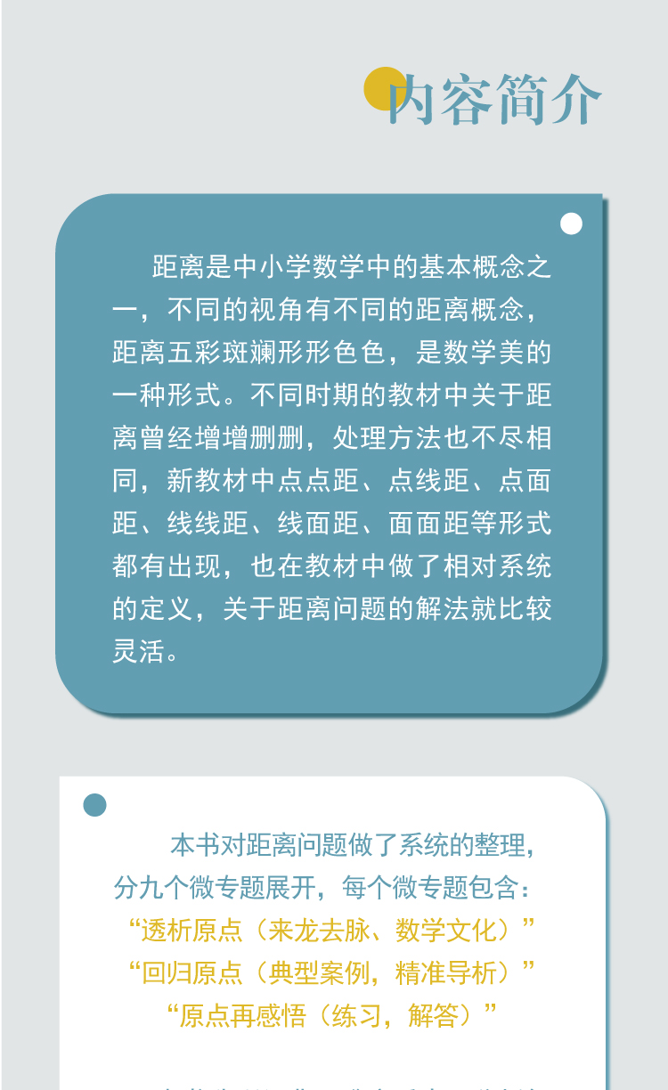 距离是中小学数学中的基本概念之一,不同的视角有不同的距离概念,距离五彩斑斓形形色色,是数学美的一种形式。不同时期的教材中关于距离曾经增增删删,处理方法也不尽相同,新教材中点点距、点线距、点面距、线线距、线面距、面面距等形式都有出现,也在教材中做了相对系统的定义,关于距离问题的解法就比较灵活。本书对距离问题做了系统的整理,分九个微专题展开,每个微专题包含“透析原点(来龙去脉、数学文化)”、“回归原点(典型案例,精准导析)”、“原点再感悟(练习,解答)”组成。本书选题经典,难度适中,分析与解有机融合,可读性极强,读完这本书,距离将只有美,没有困难。