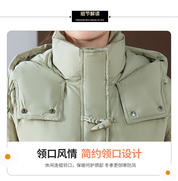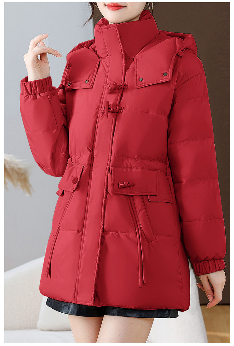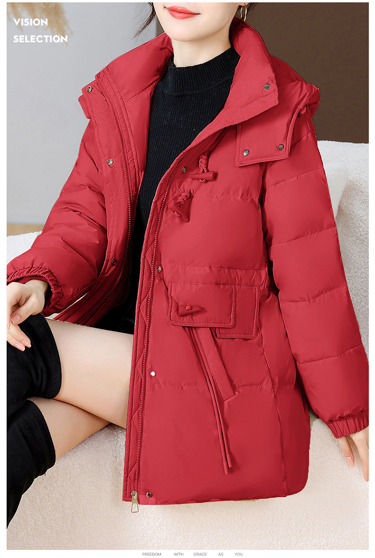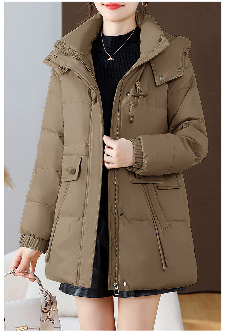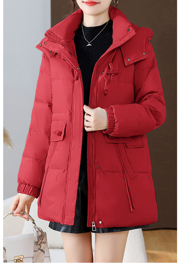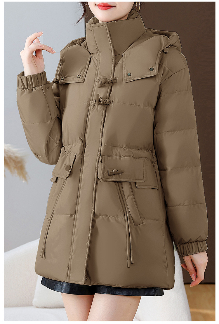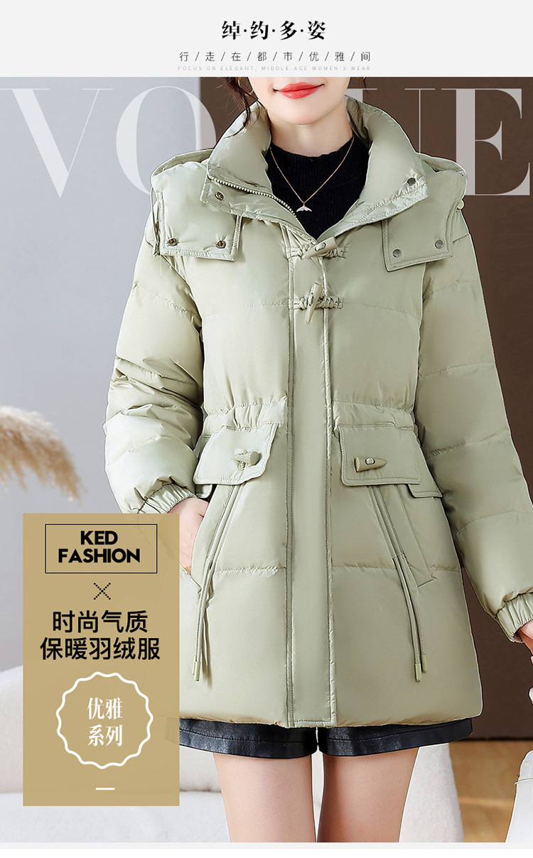 连帽厚款羽绒服,时尚新款拉链牛角扣中长款休闲羽绒服冬季保暖女装QYM-KED-338052-Y