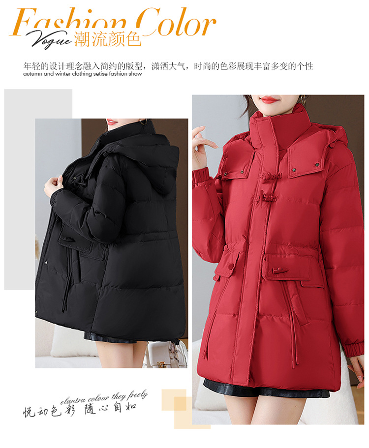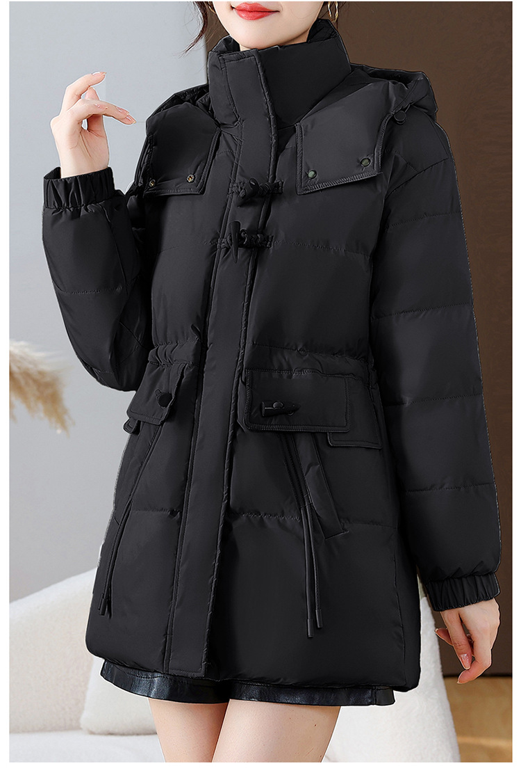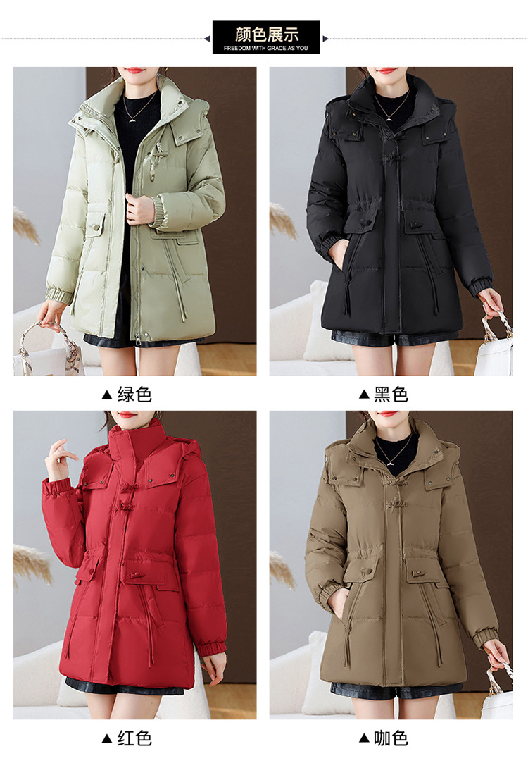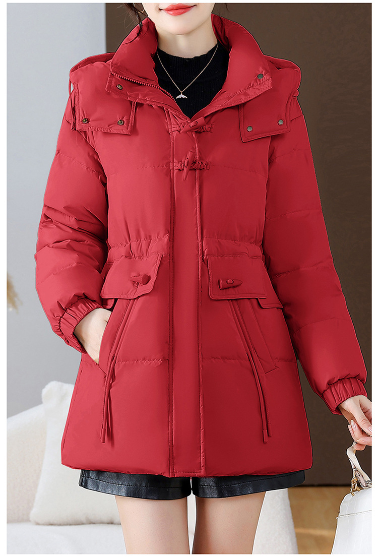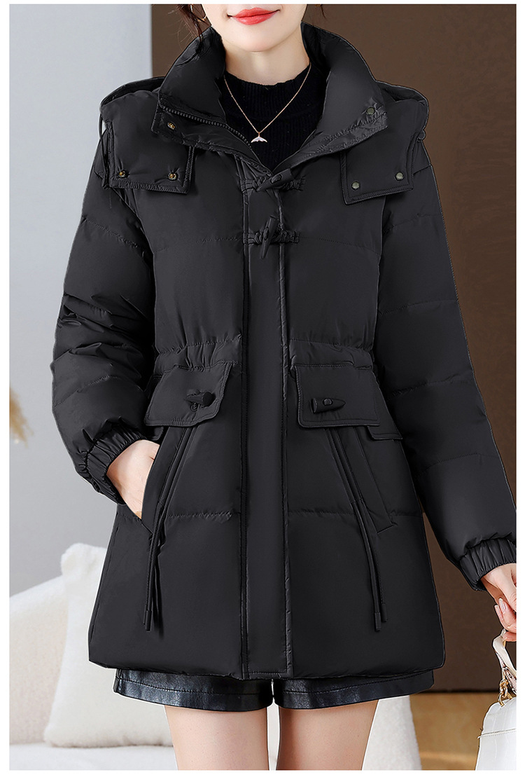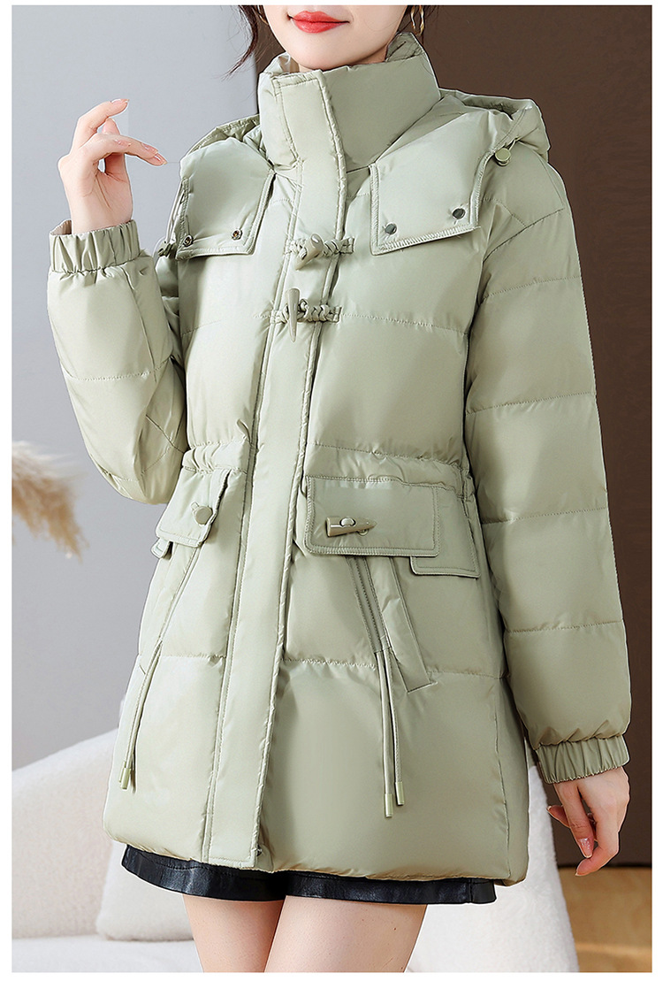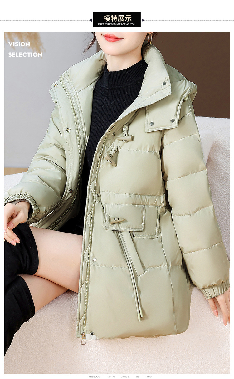 连帽厚款羽绒服,时尚新款拉链牛角扣中长款休闲羽绒服冬季保暖女装QYM-KED-338052-Y