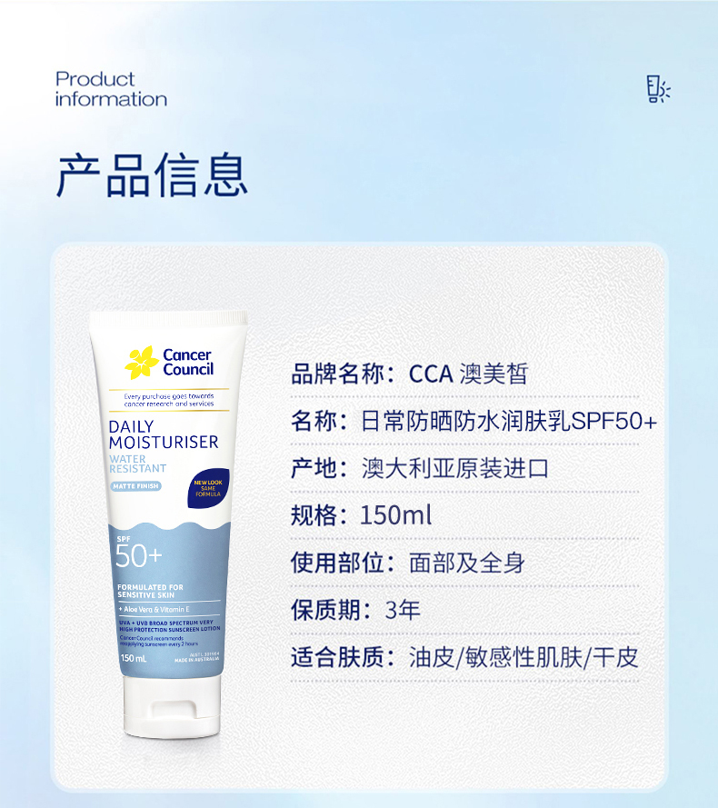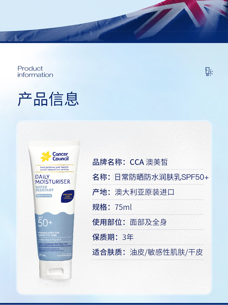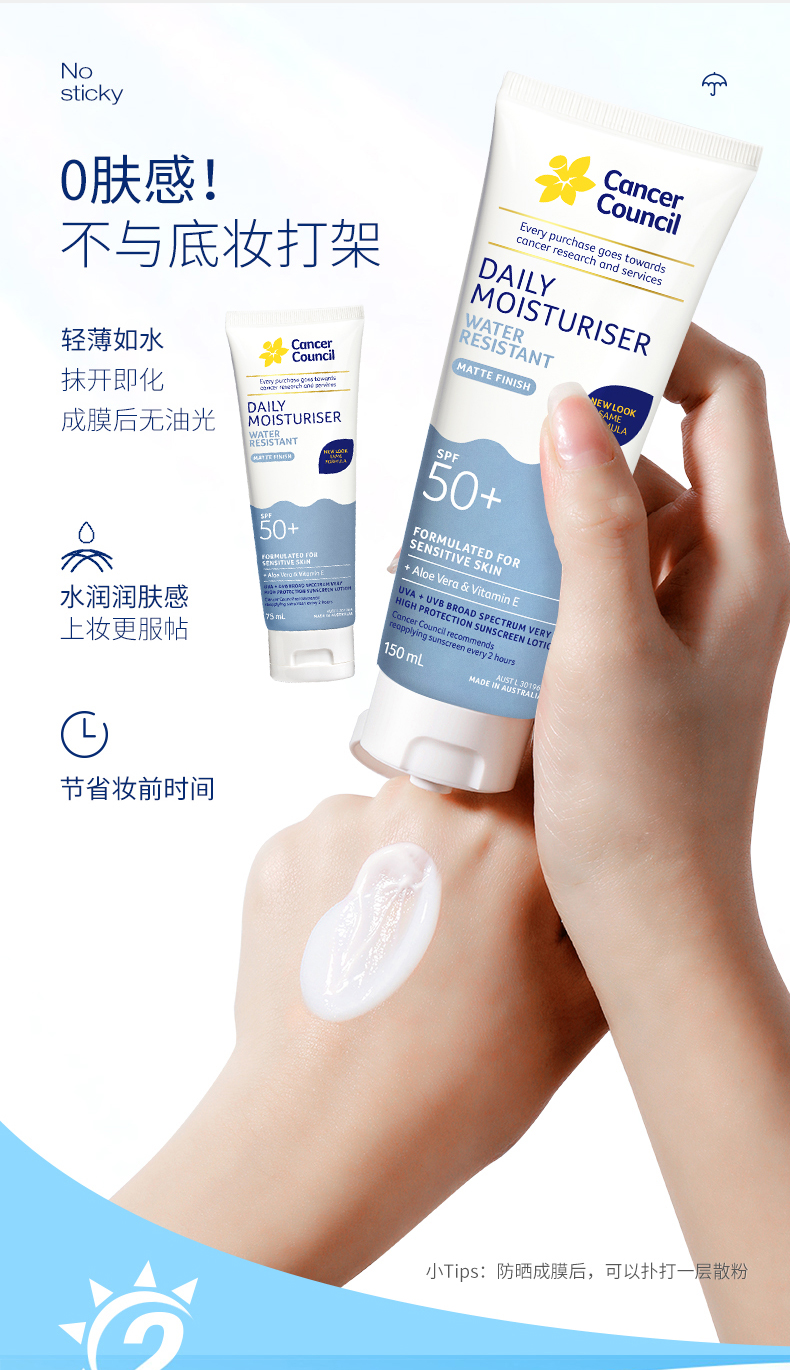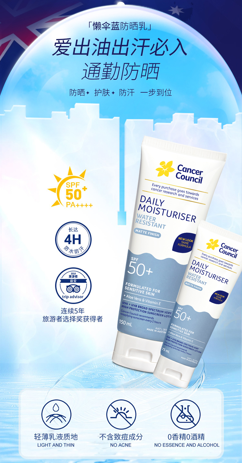 CancerCouncil澳美皙蓝色户外防水防晒霜SPF50+75ml 150m