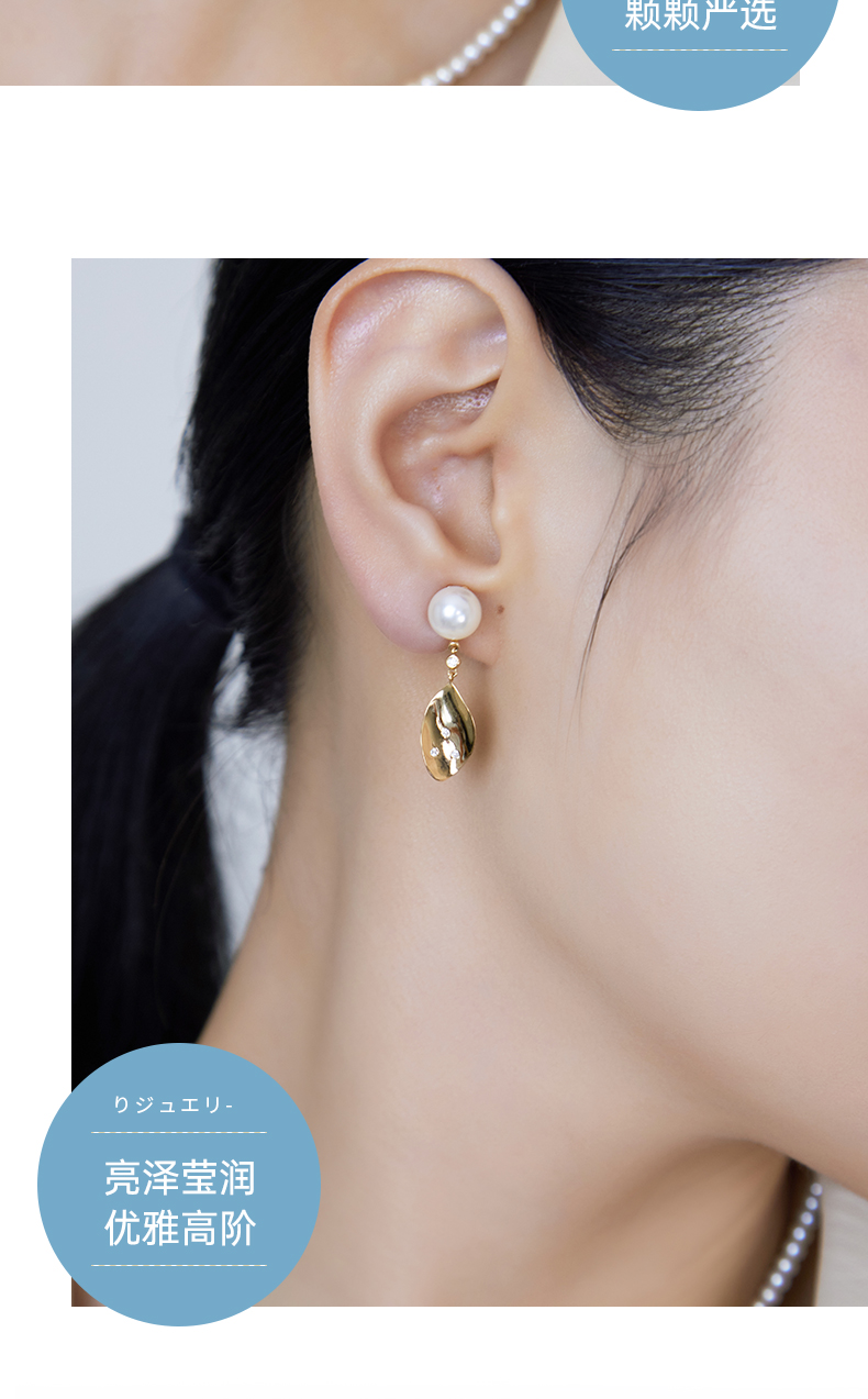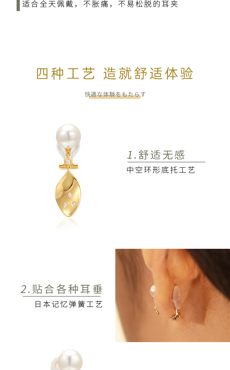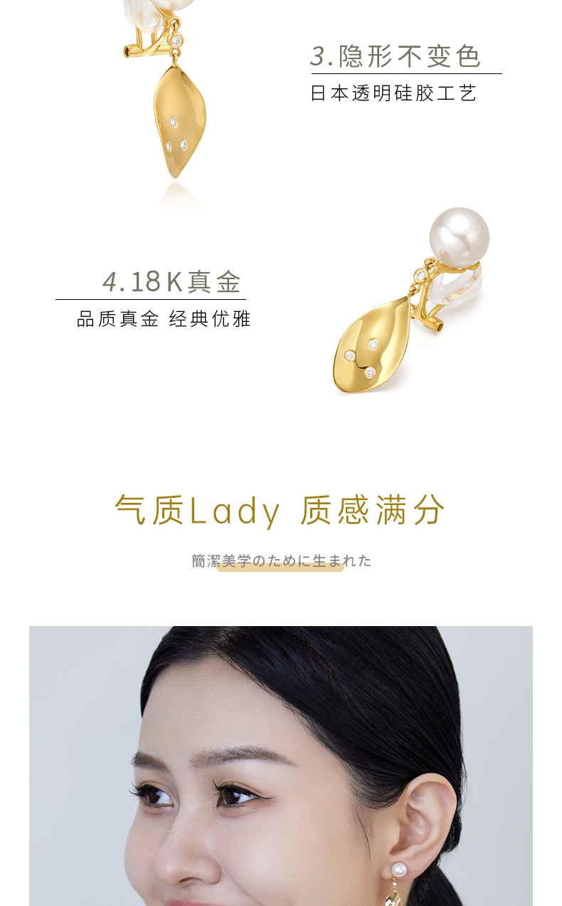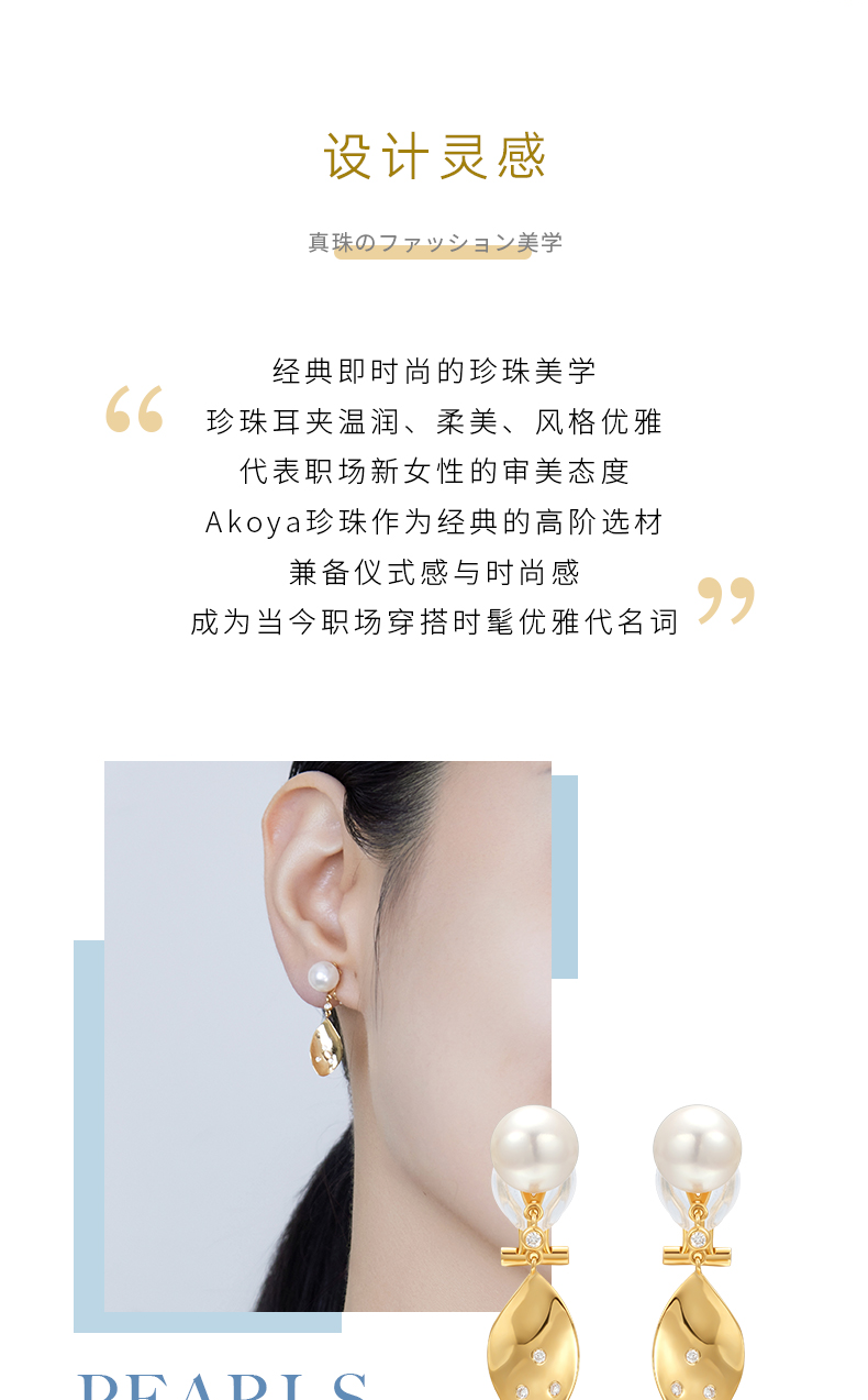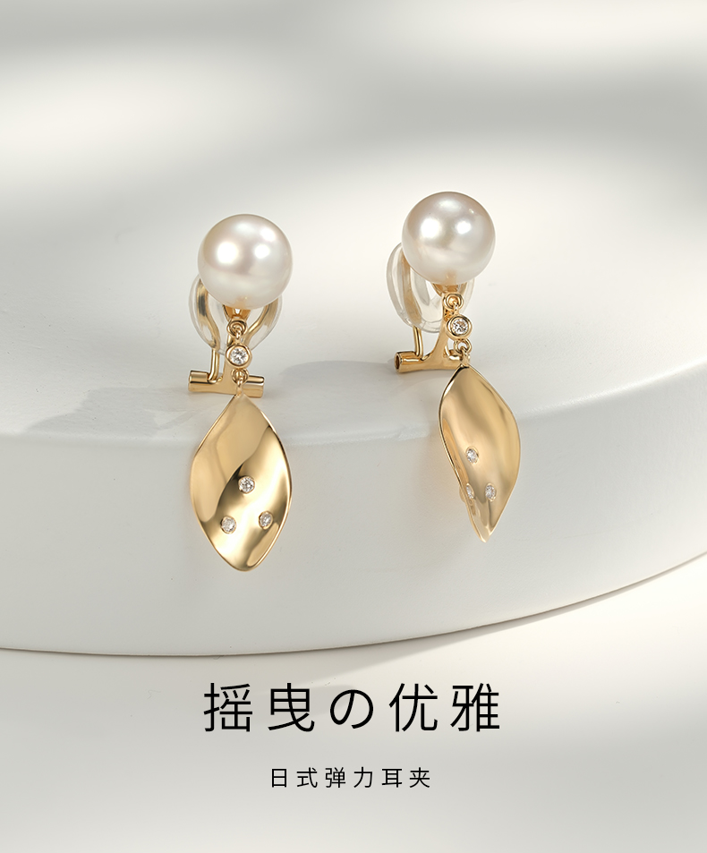 【天猫同款】悦甄18K金Akoya珍珠钻石耳夹 金叶
