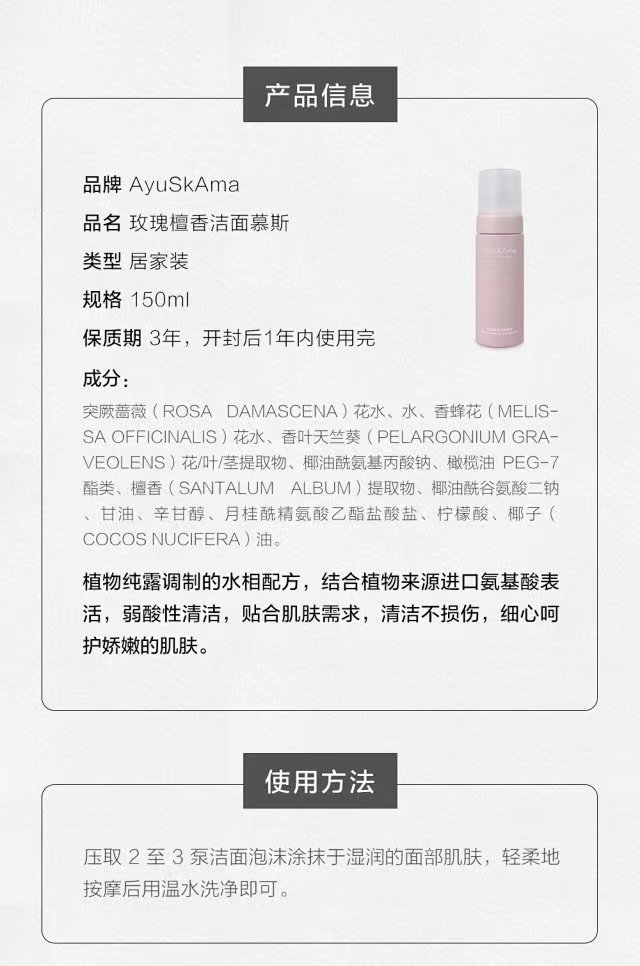 猫太推荐---AyuSkAma 玫瑰檀香洁面慕斯(居家装)150ml