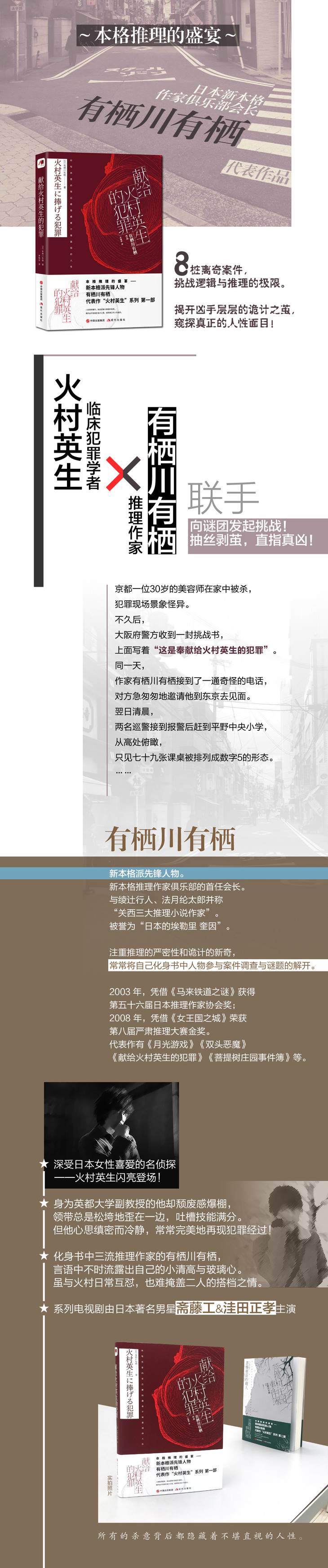 ★ 在本系列中,深受日本女性喜爱的名侦探——火村英生闪亮登场!身为英都大学副教授的他却没有一点学者的样子,领带总是松垮地歪在一边,喜欢吐槽。但他心思缜密而冷静,常常完美地再现犯罪经过!