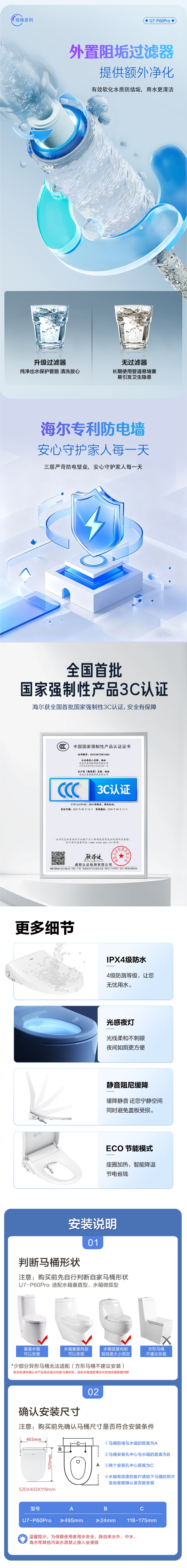 海尔(Haier)智能马桶盖 适配U型D型马桶 即热遥控 清洗暖风烘干夜灯 座圈加热 泡沫盾 抗菌除臭 【海尔售后 免费安装】U7-P60PRO
