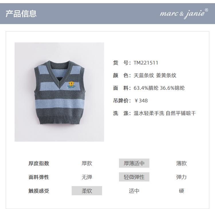 【柔蓝绒】马克珍妮秋装新款 男童V领学院风针织马甲221511
