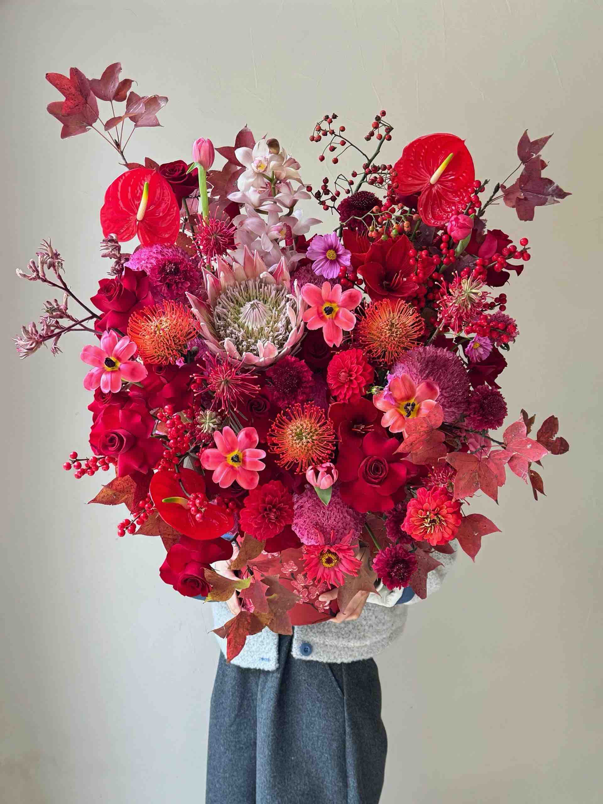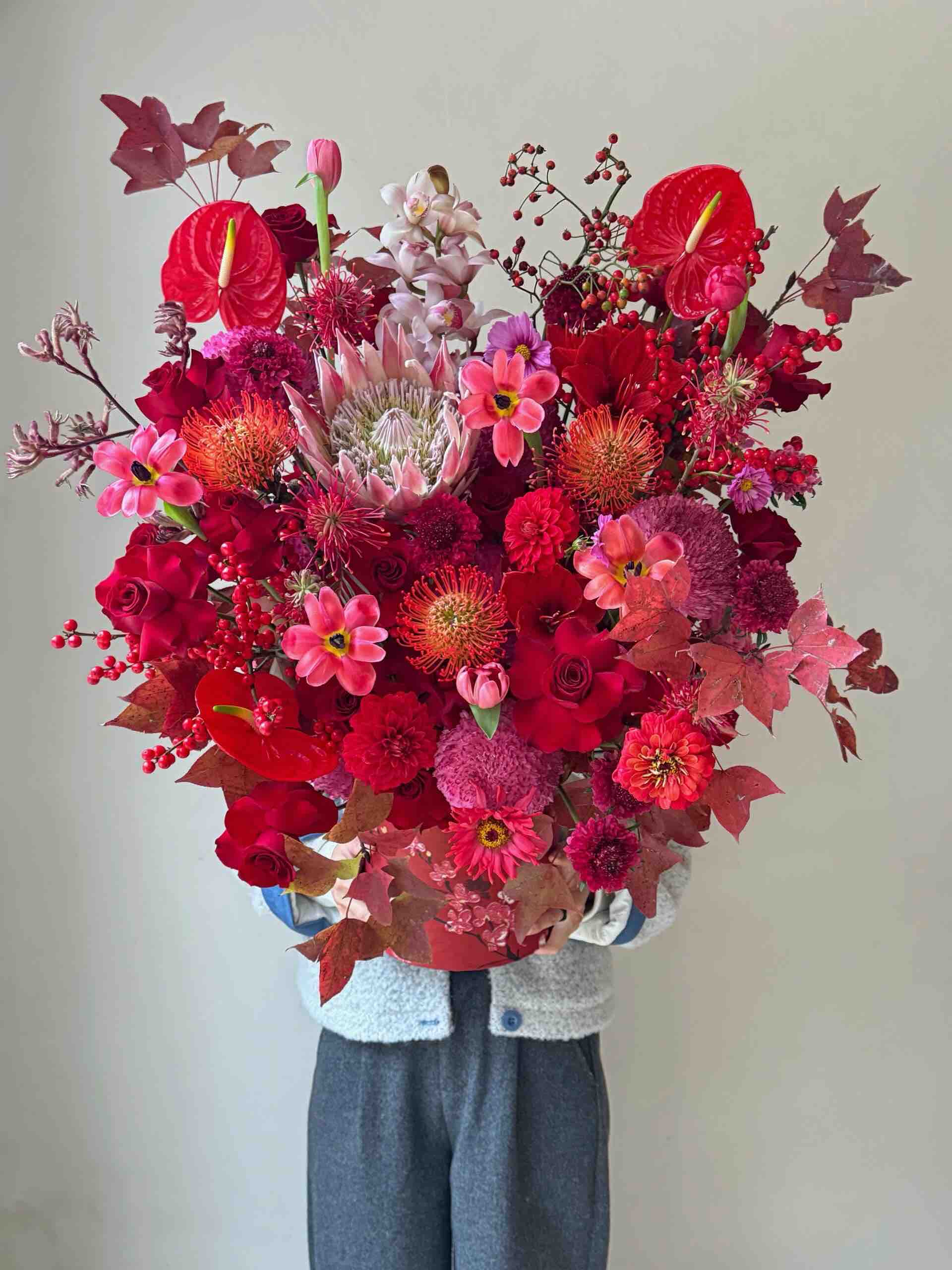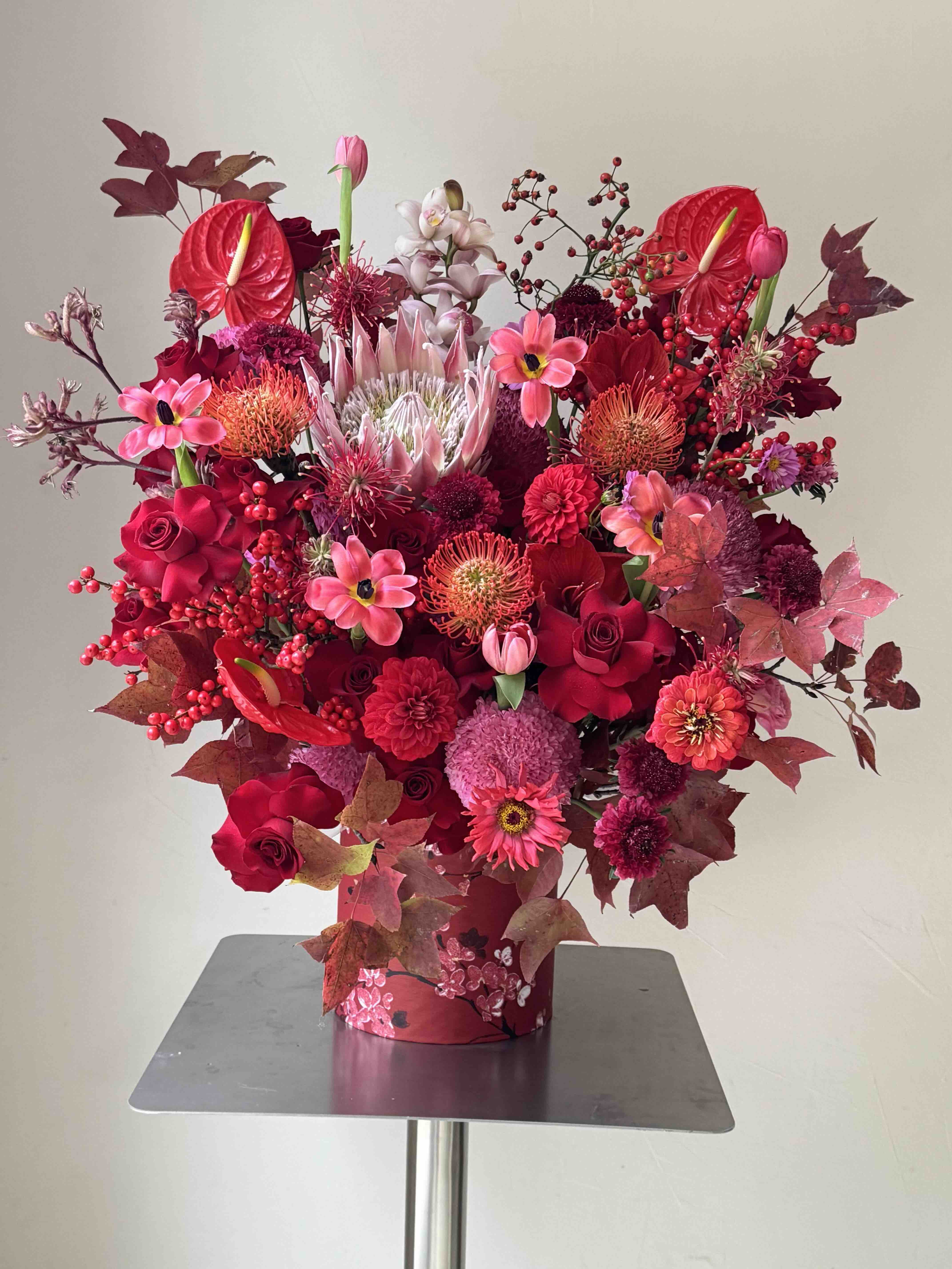 《蝶汐》帝王花针垫红掌冬青蕙兰花束