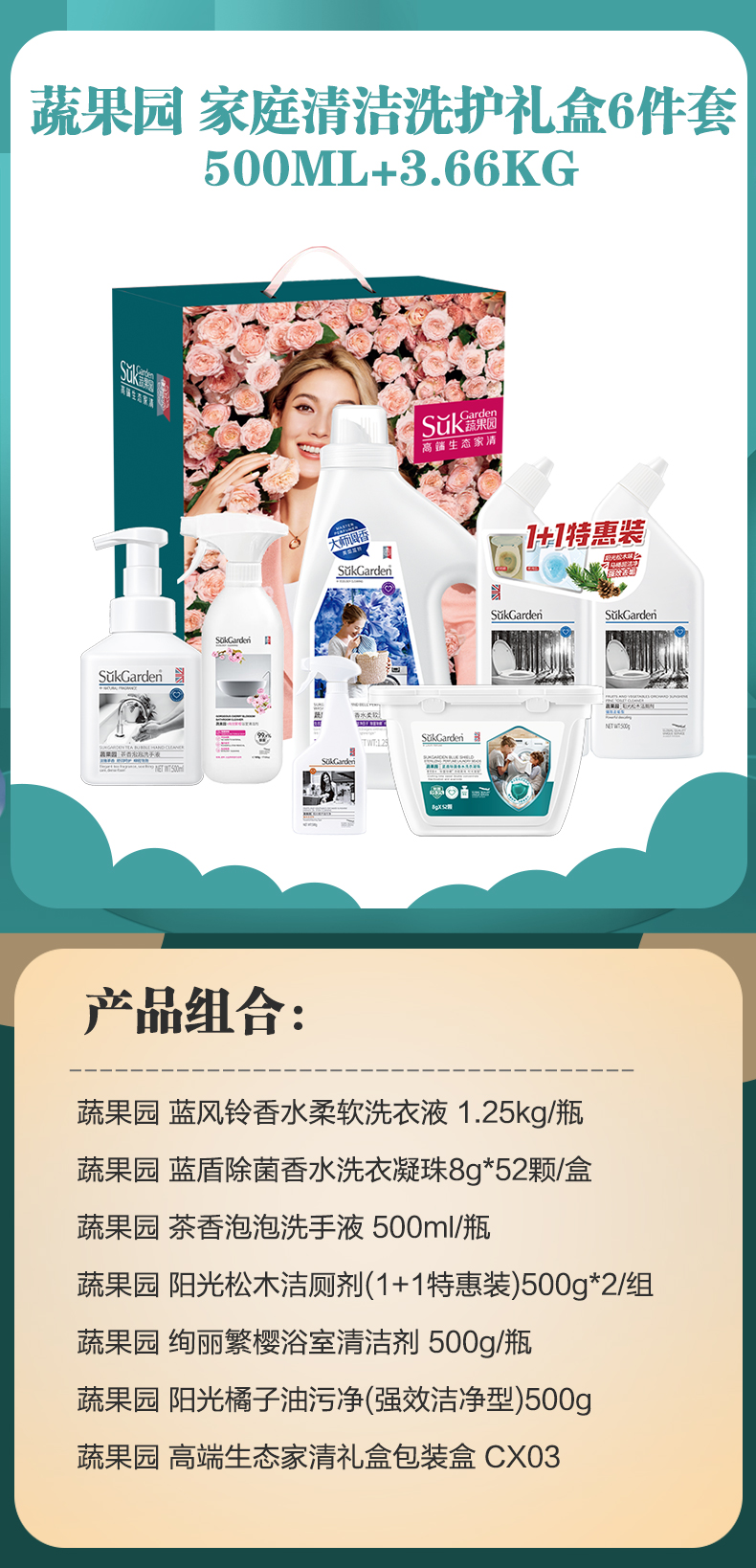 蔬果园 家庭清洁洗护礼盒6件套 500ML+3.66KG 家庭套装去污除菌