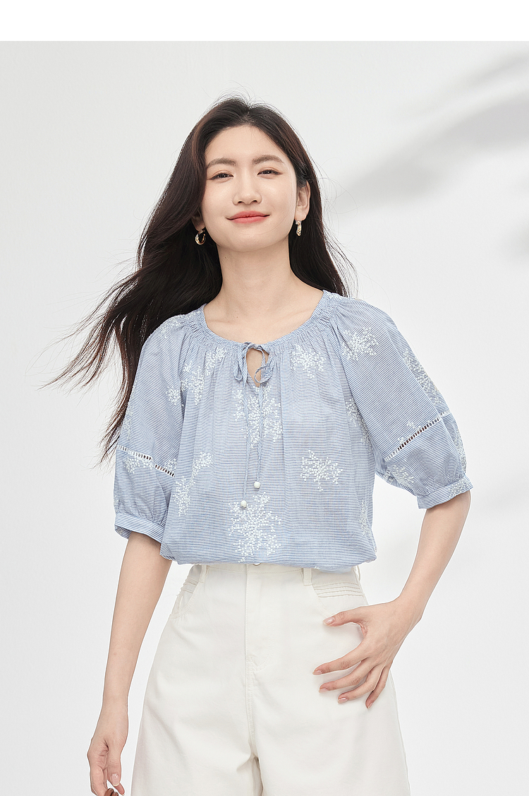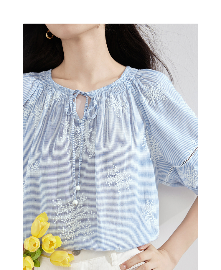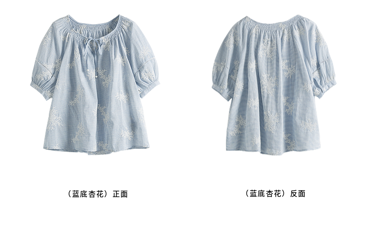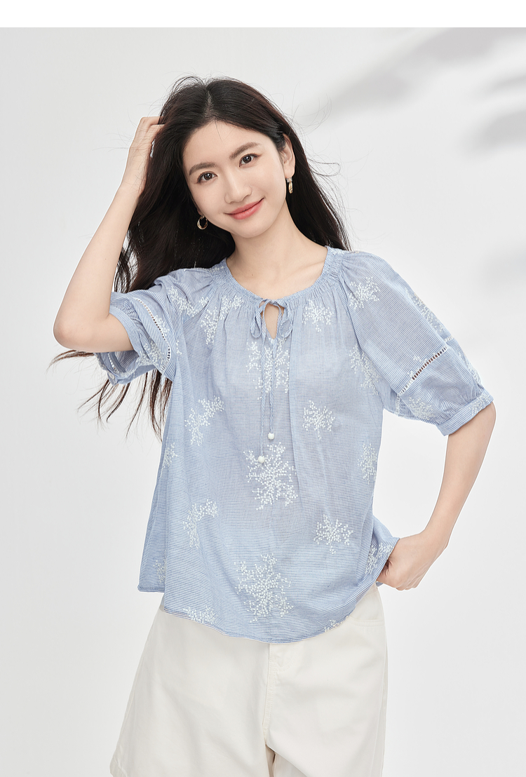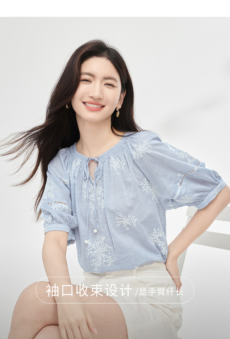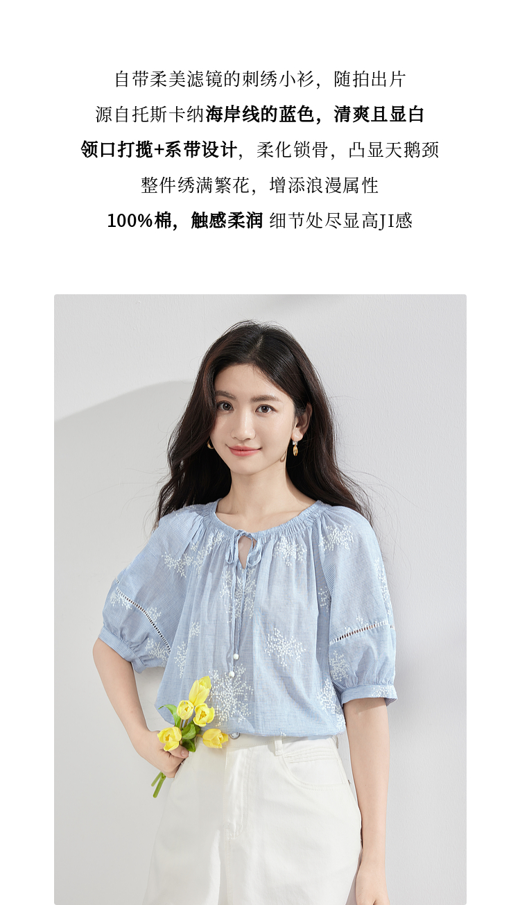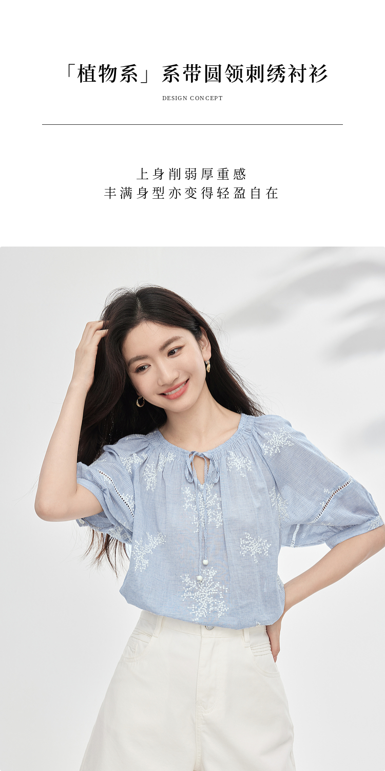 【夏日新品】熙世界法式重工刺绣衬衫女短袖夏季宽松小众设计系带圆领全棉上衣