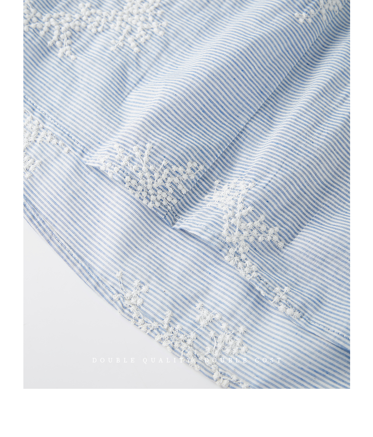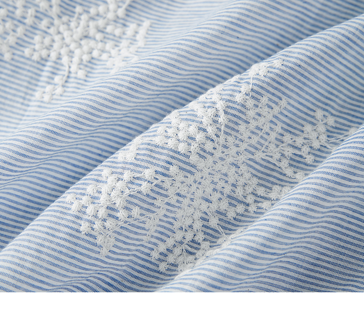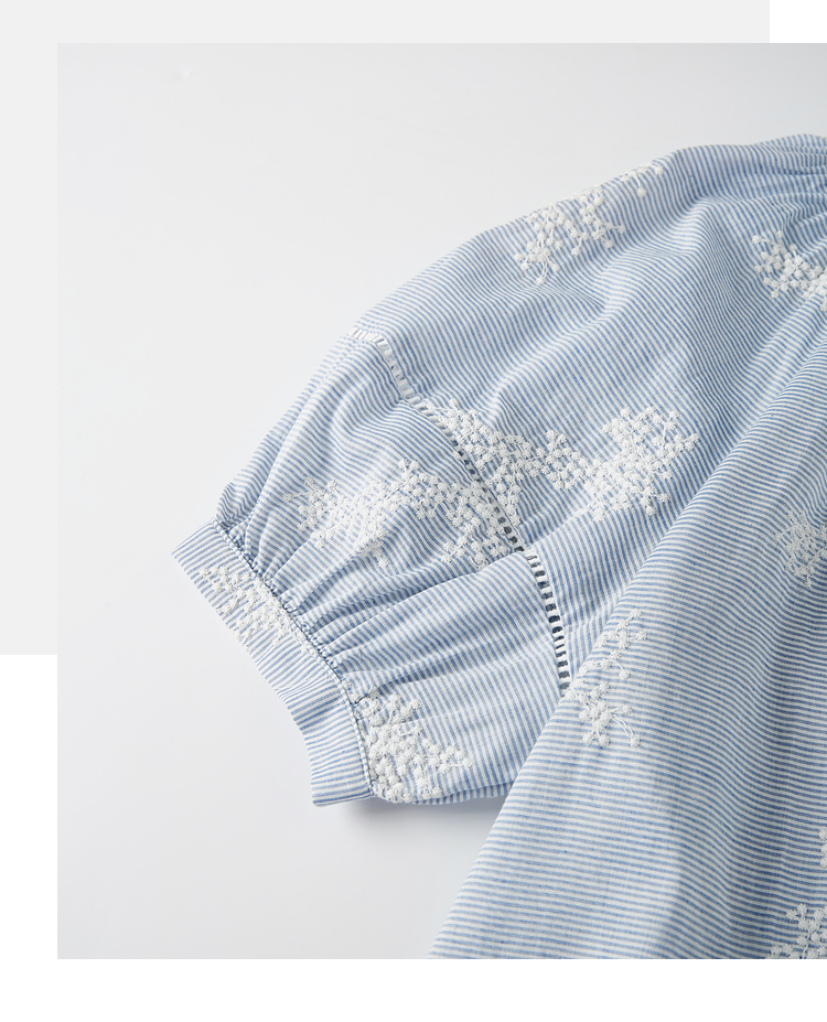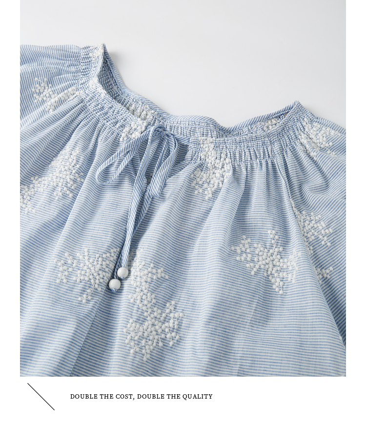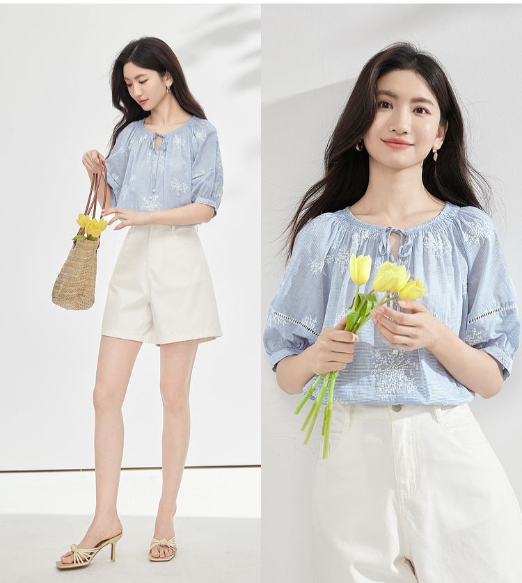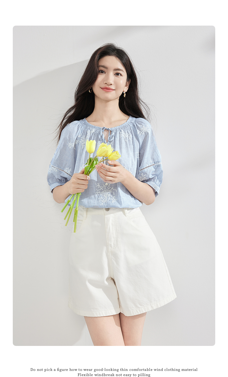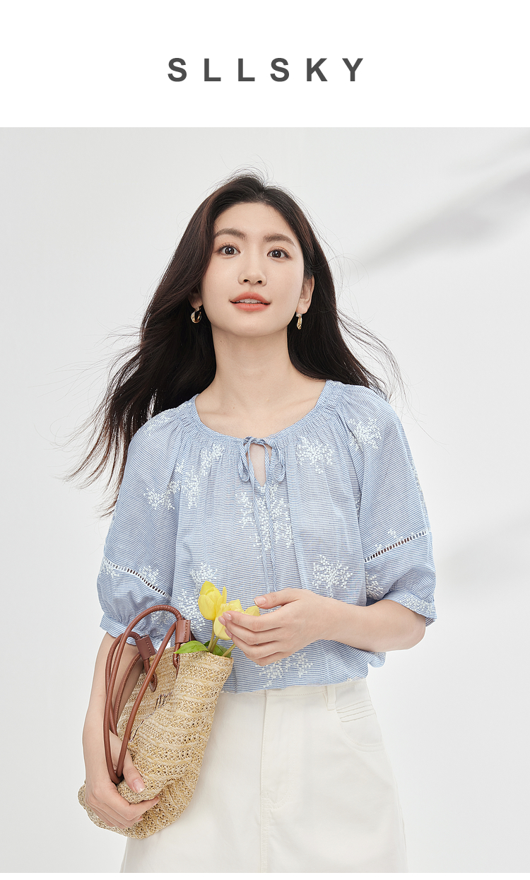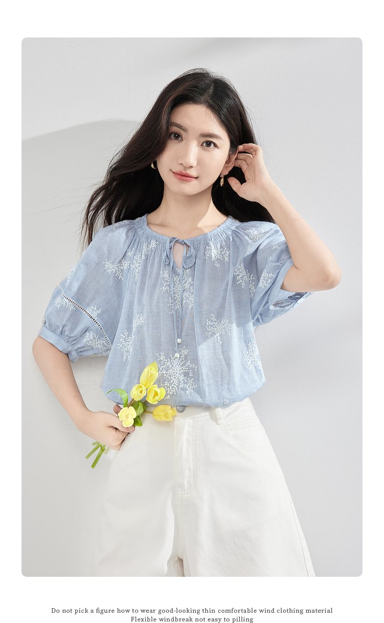 【夏日新品】熙世界法式重工刺绣衬衫女短袖夏季宽松小众设计系带圆领全棉上衣