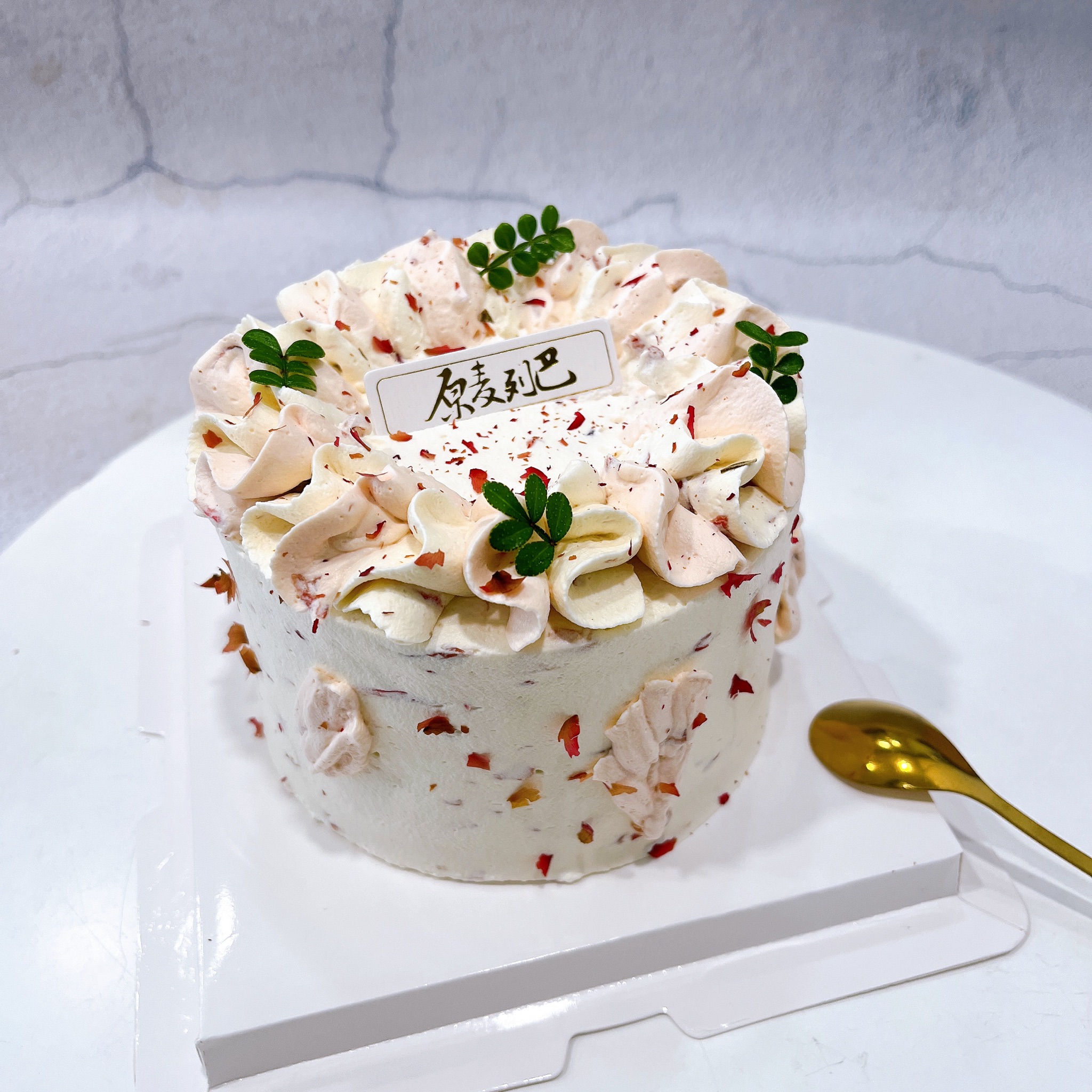 主要原料:进口纯动物奶油、戚风蛋糕胚、玫瑰花瓣、红豆、薄脆。