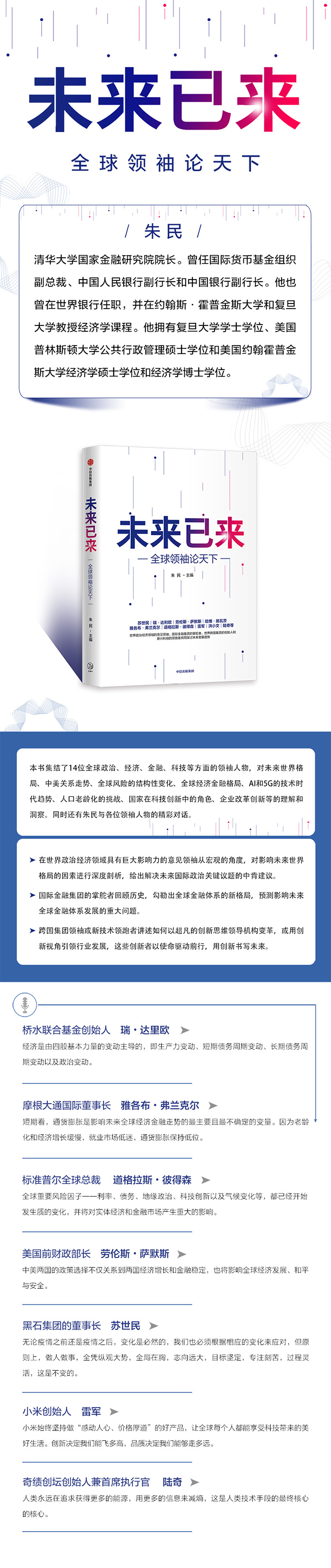 本书是全球政治、经济、金融、企业等方面的人物在清华大学五道口金融学院和国家金融研究院主办的“未来已来——全球论天下”系列讲座的演讲和现场对话专集。演讲者包括桥水基金创始人瑞·达利欧,黑石集团董事长苏世民,美国前财政部长劳伦斯·萨默斯,红十字委员会主席兼外交官彼得·毛雷尔,摩根大通董事局主席雅各布·弗兰克尔,标准普尔公司全球总裁兼执行官道格拉斯·彼得森,货币基金组织经济学家吉塔·戈皮纳特,欧洲复兴开发银行原行长苏马·查克拉巴蒂,高盛前总裁兼联席运营官哈维·施瓦茨,小米科技创始人、董事长兼执行官雷军,资生堂全球总裁兼执行官鱼谷雅彦,微软全球资深副总裁洪小文,奇绩创坛创始人兼执行官陆奇和哈佛大学肯尼迪政治学院首任院长格雷厄姆·艾利森。