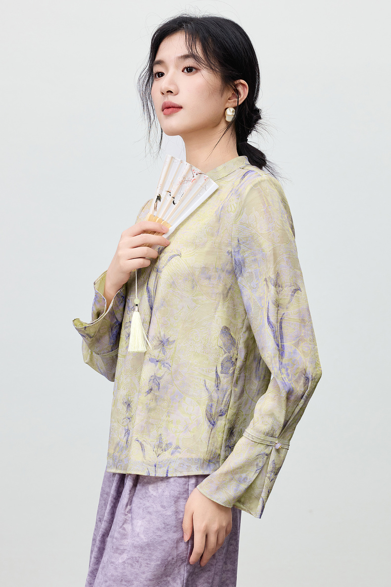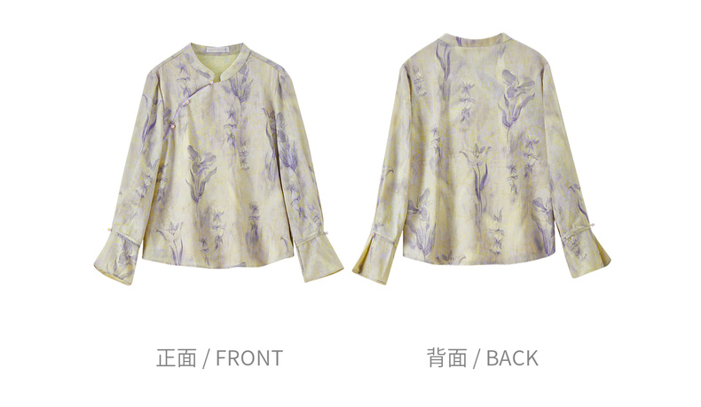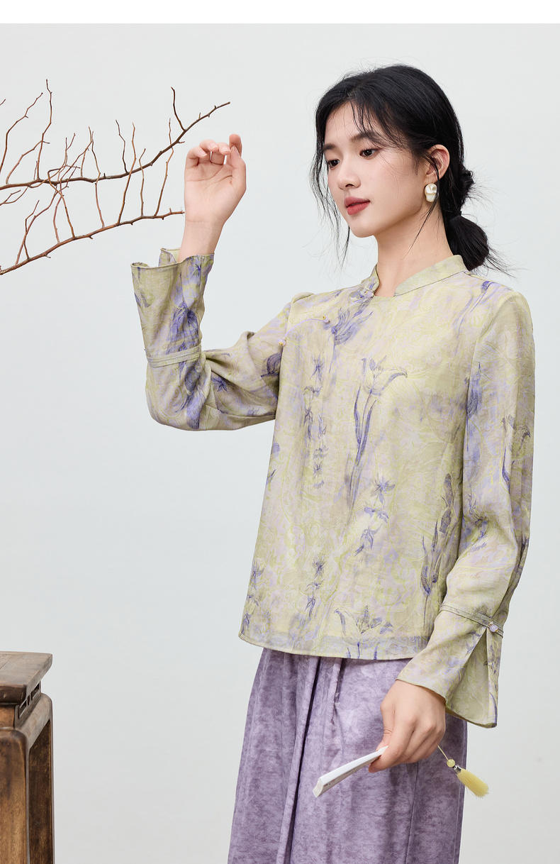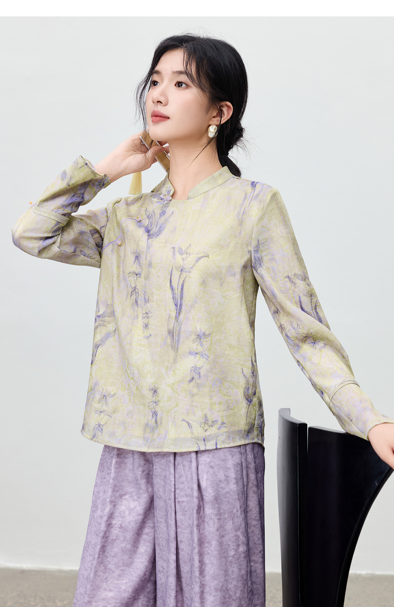 【内购】【风过鸢尾】优雅国风立领斜门襟珠扣喇叭袖提花衬衫-Q53CN4008