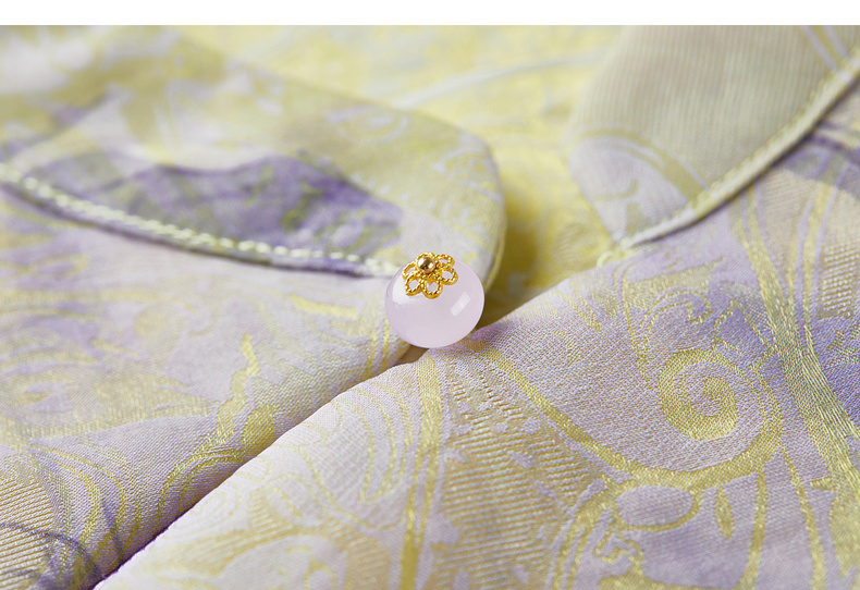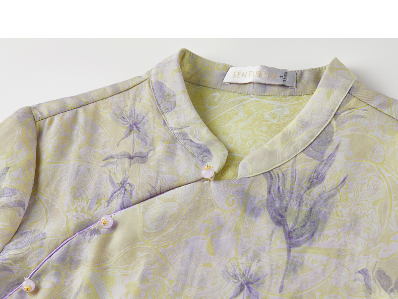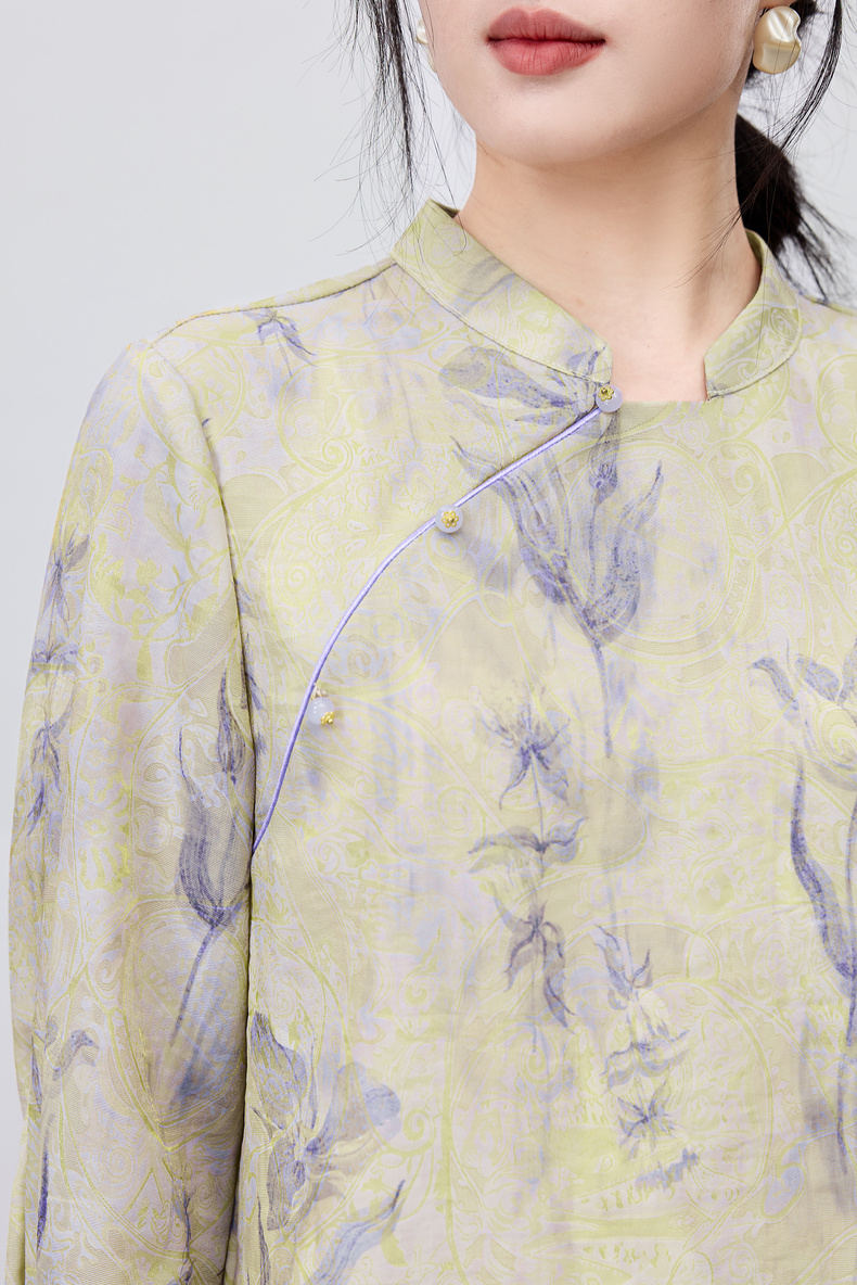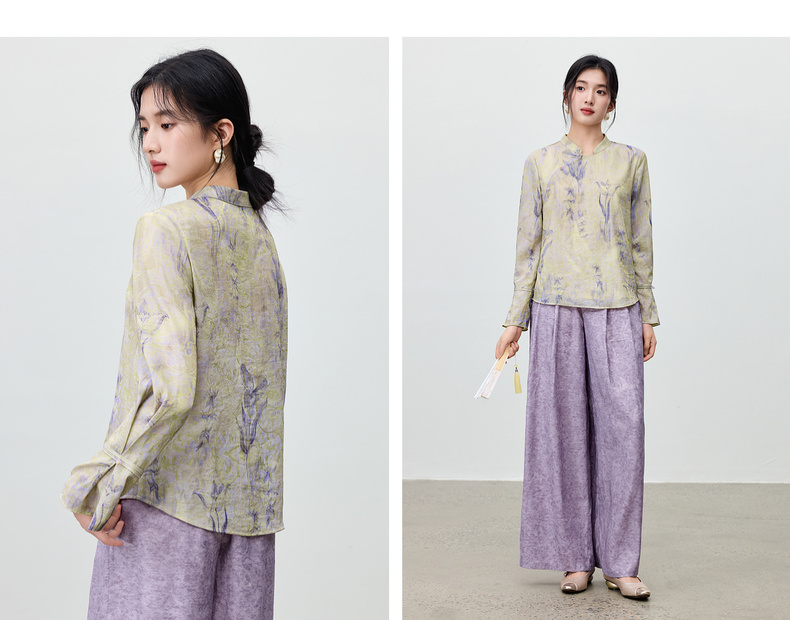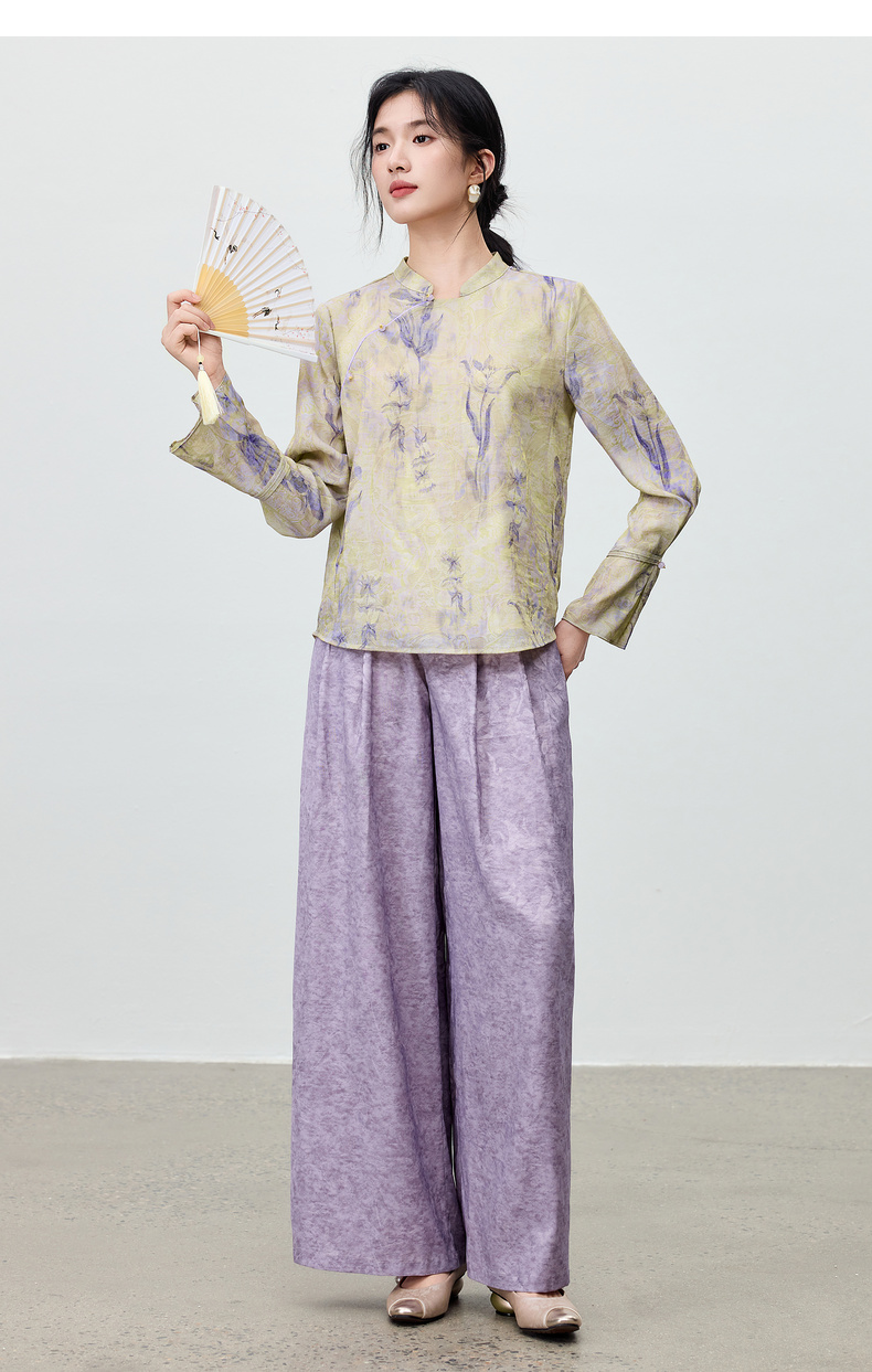 【内购】【风过鸢尾】优雅国风立领斜门襟珠扣喇叭袖提花衬衫-Q53CN4008