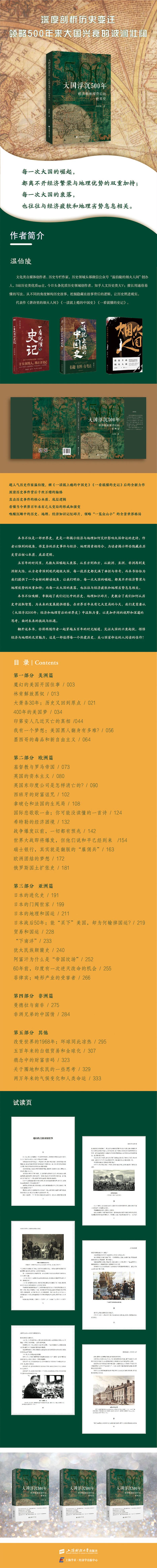 《大国浮沉500年:经济和地理背后的世界史》是超人气历史作家温伯陵,继《一读就上瘾的中国史》《一看就懂的史记》后的全新力作,作者仍然延续其擅长的通俗易懂写法,作者这次放眼世界,用独特的角度解构世界大局,帮你厘清当下世界百年未有之大变局背后千丝万缕的脉络,看懂当今世界大局的形成、演变和未来趋势。 作者打破中国文人写作时的含蓄、伏笔、留白的文风,利用丰富的知识储备和严密的史料分析,使用通俗的比喻、直白的语言描述,直击历史事件的核心本质,把很多普通人记忆中散落的历史、地理、经济知识碎片串联、组合起来,拼合成一副全面、完整的世界局势全图,读罢令人醍醐灌顶、思路顿开,让普通人也能领略到“一览众山小”的伟人胸襟、韬略。 本书不仅是一部世界史,更是一部揭示经济与地理如何交织影响大国命运的史诗。作者以独到的视角,将复杂的历史事件与经济、地理因素相结合,为读者揭示那些隐藏在历史背后核心本质、底层逻辑。 五百......
