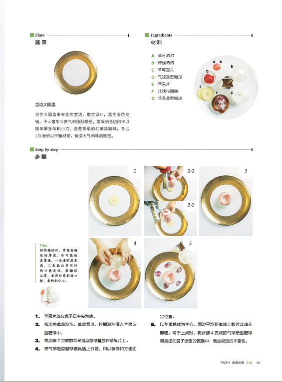 ●从模仿开始到找到自己的风格 一开始练习摆盘,建议从模仿开始,选择自己喜欢 的风格下手,揣摩作品的设计结构、色彩等细节后, 慢慢开始尝试各种摆盘方法,思考一样的素材能有 怎样不同的创意,学习自己想要表达的美感。