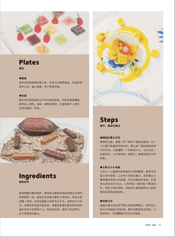 ●结构设计 摆盘一般分为两种类型:一种是通过各种小份的食 材组合而成;另一种则是成品的摆盘,这也是初学 者能够快速开始学习的类型。此种摆盘要特别注意 清楚表达成品的样貌,不要为了填满空间而装饰。 例如,已经摆了巧克力就不要再添加水果、酱汁等 等不相关、没有意义的装饰抢去风采,通过做减法 突显主体。还要记得整体构图的聚焦,例如主体如 果足够明显,就将装饰往外摆,并且不要忽视立体 感,可以使用不同角度或多重堆叠的手法呈现。