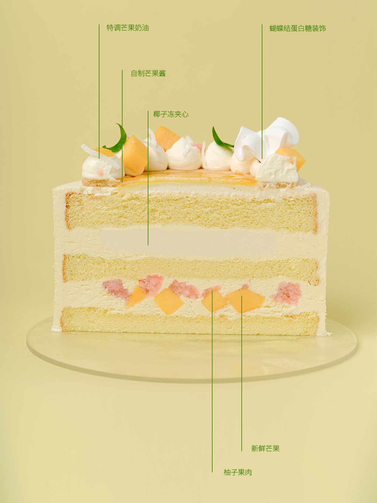 作为一年四季的水果保障,芒果是当之无愧的优秀蛋糕搭配,不会出错的水果蛋糕又为大家增添一个选择,杨枝甘露的经典搭配,糅合了椰子温和的奶香和柚子果肉,老少皆宜,香甜实在