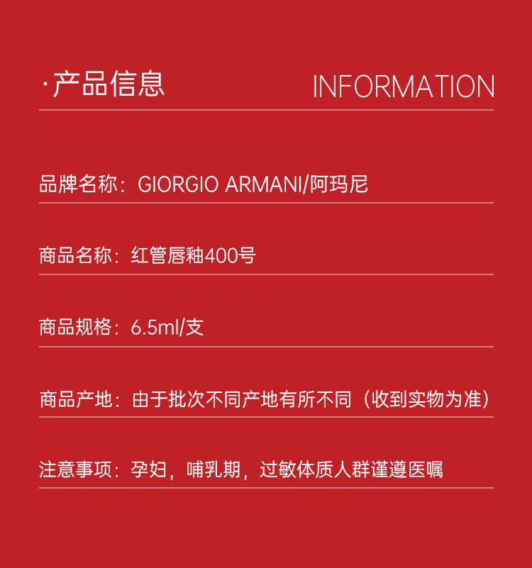 【跨境】GIORGIOARMANI 阿玛尼 红管唇釉 6.5ml #400