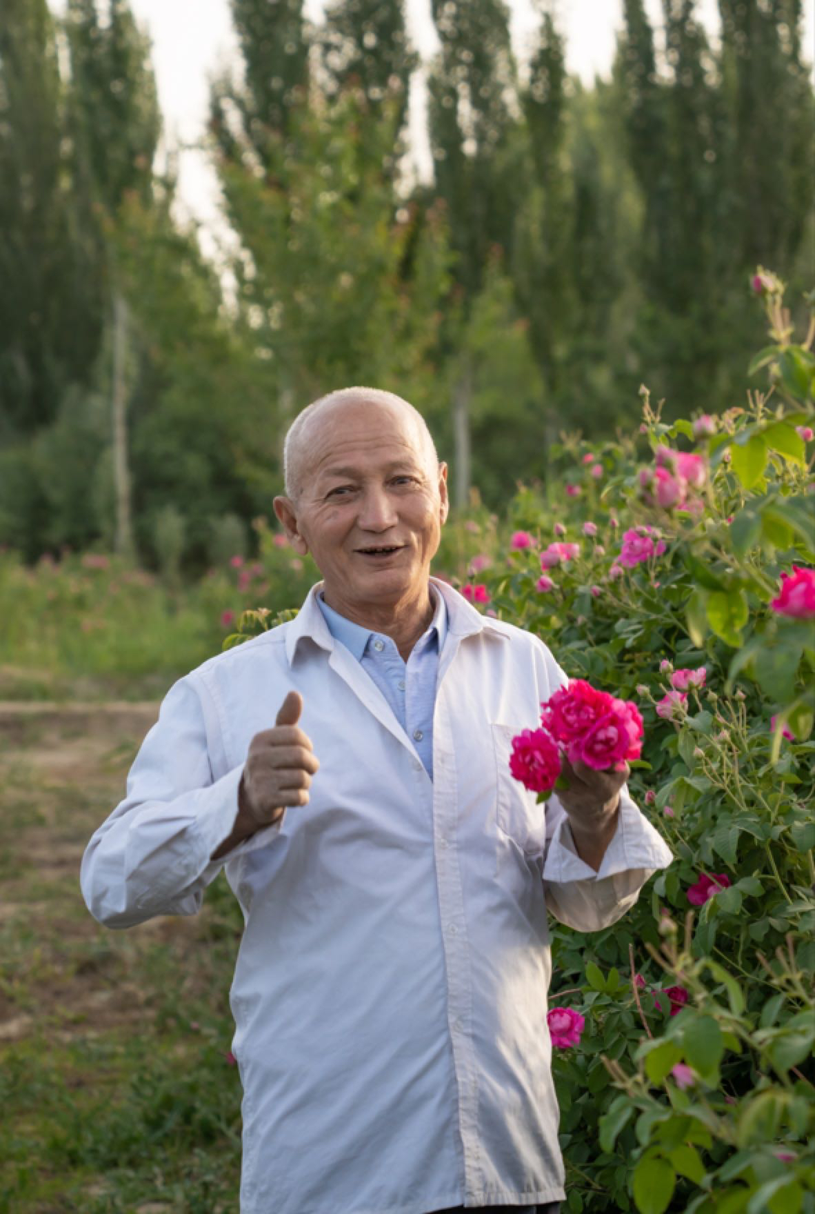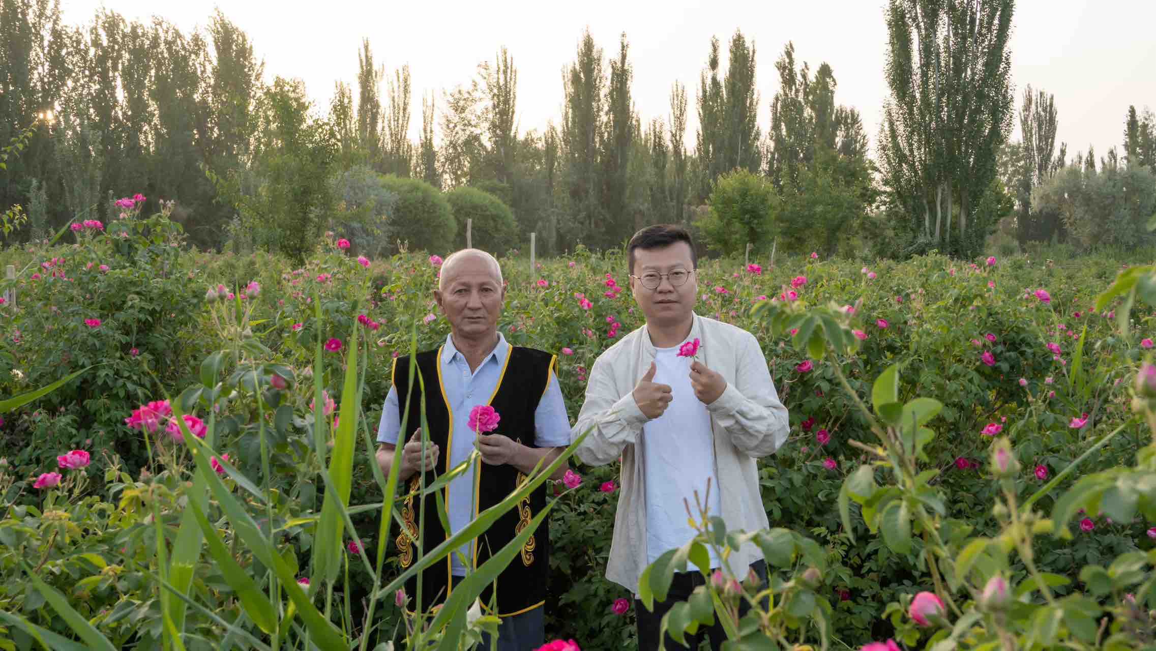 凌晨采摘玫瑰花的场景,这个时间段的玫瑰花,饱含露水,为了控制好这个时间,做了很多年基础准备