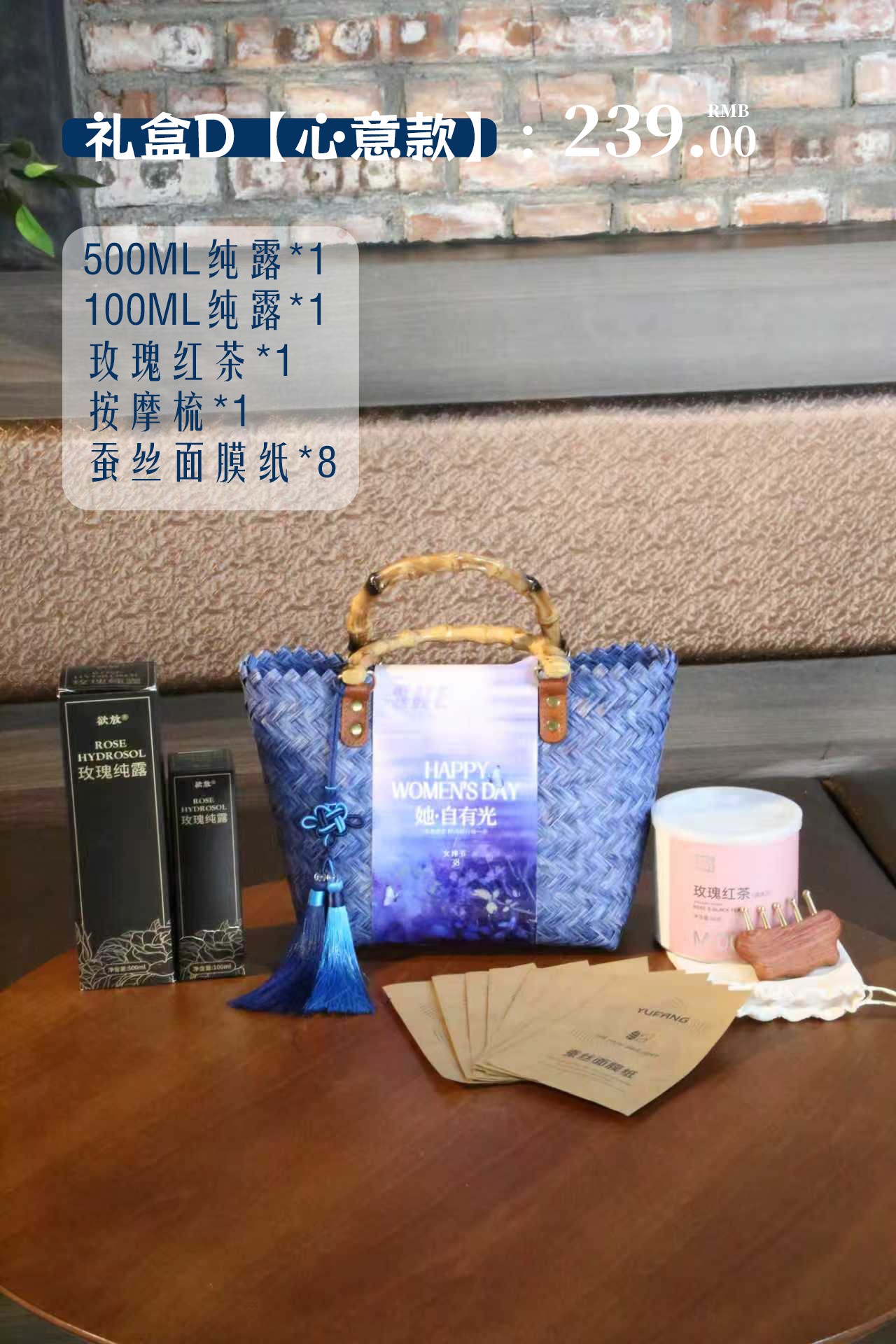 【D款心意礼】500ml纯露+100ml纯露+玫瑰红茶+按摩梳+蚕丝面膜*8