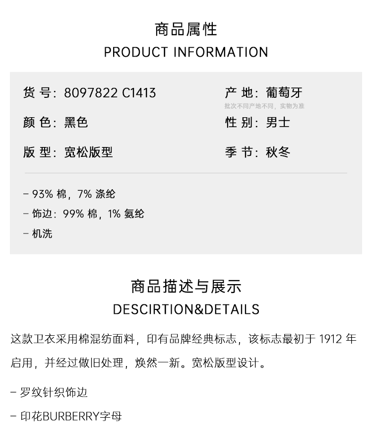 【一】BURBERRY 巴宝莉 男士徽标装饰棉质混纺运动卫衣 黑色 8097822 C1413