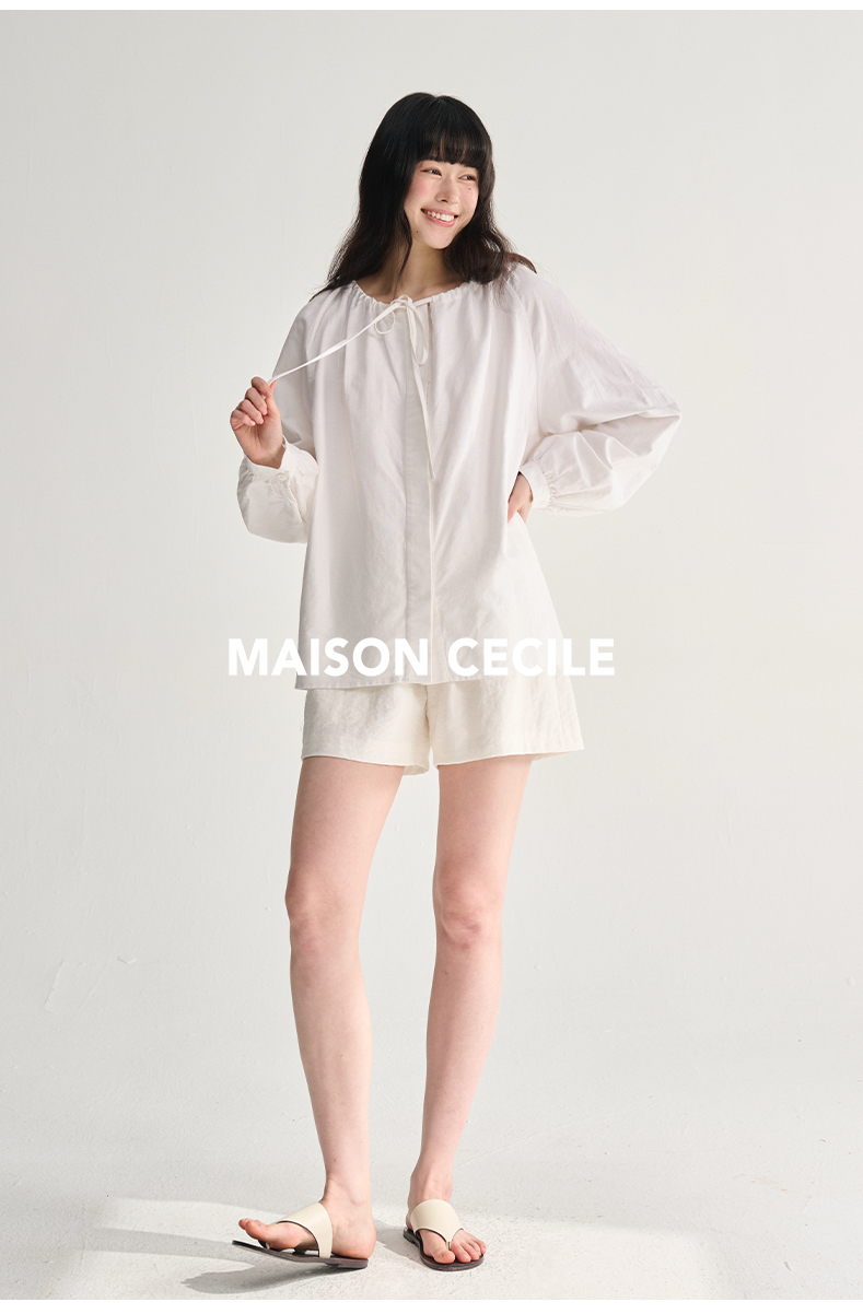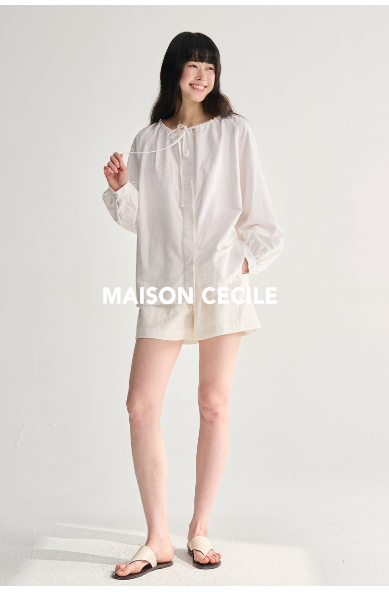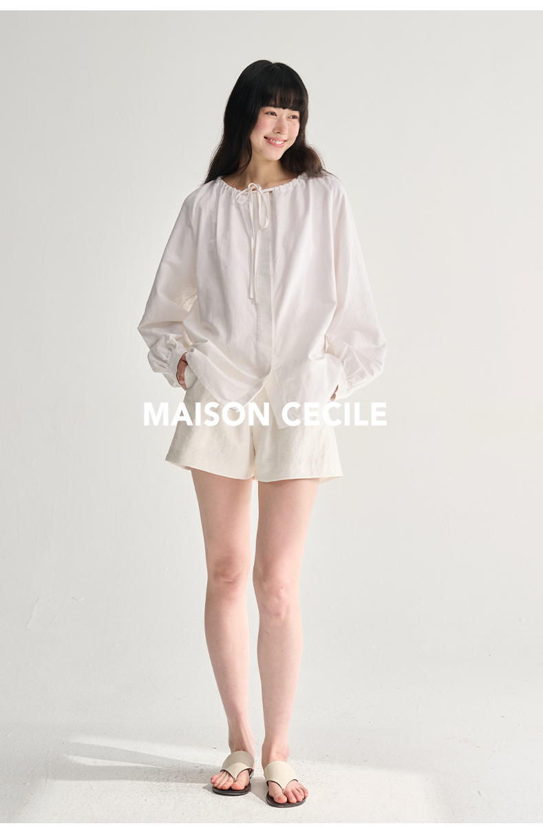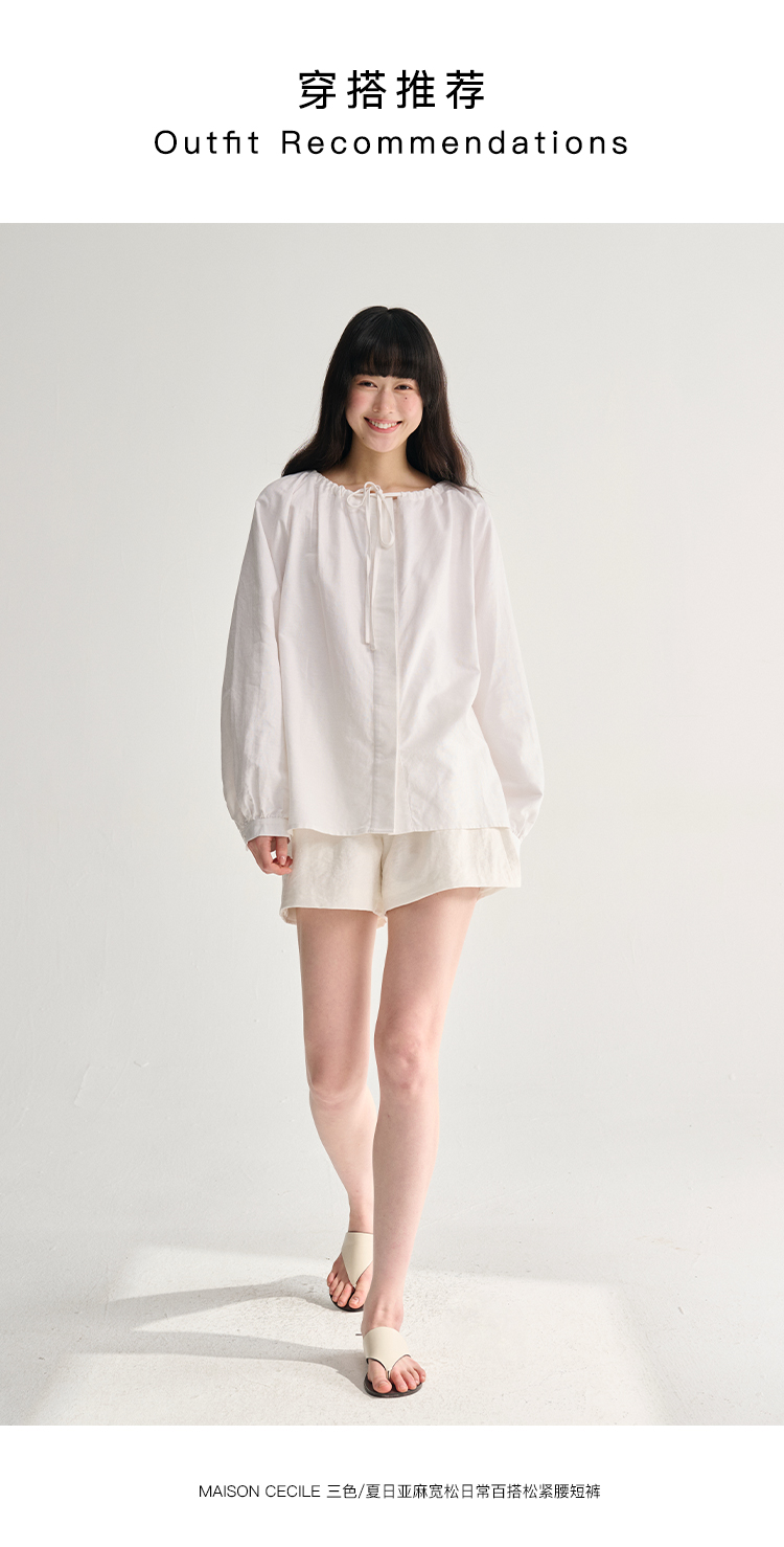 MAISON CECILE亚麻肌理感可调节抽绳圆领宽松简约白衬衫