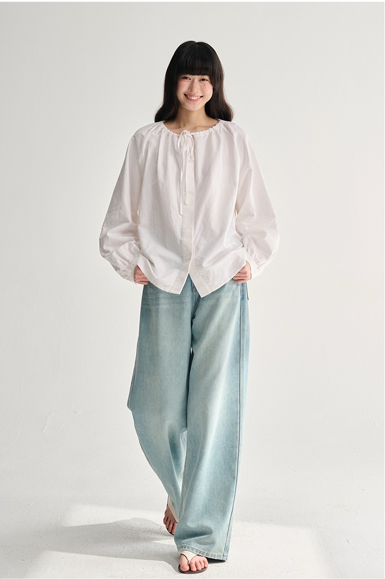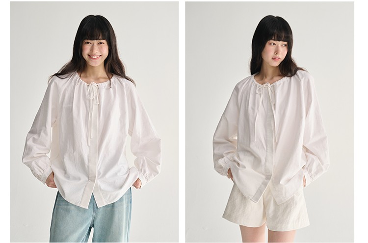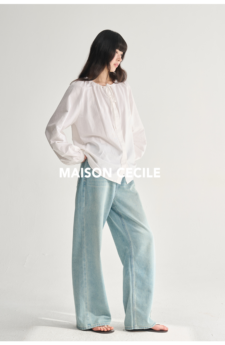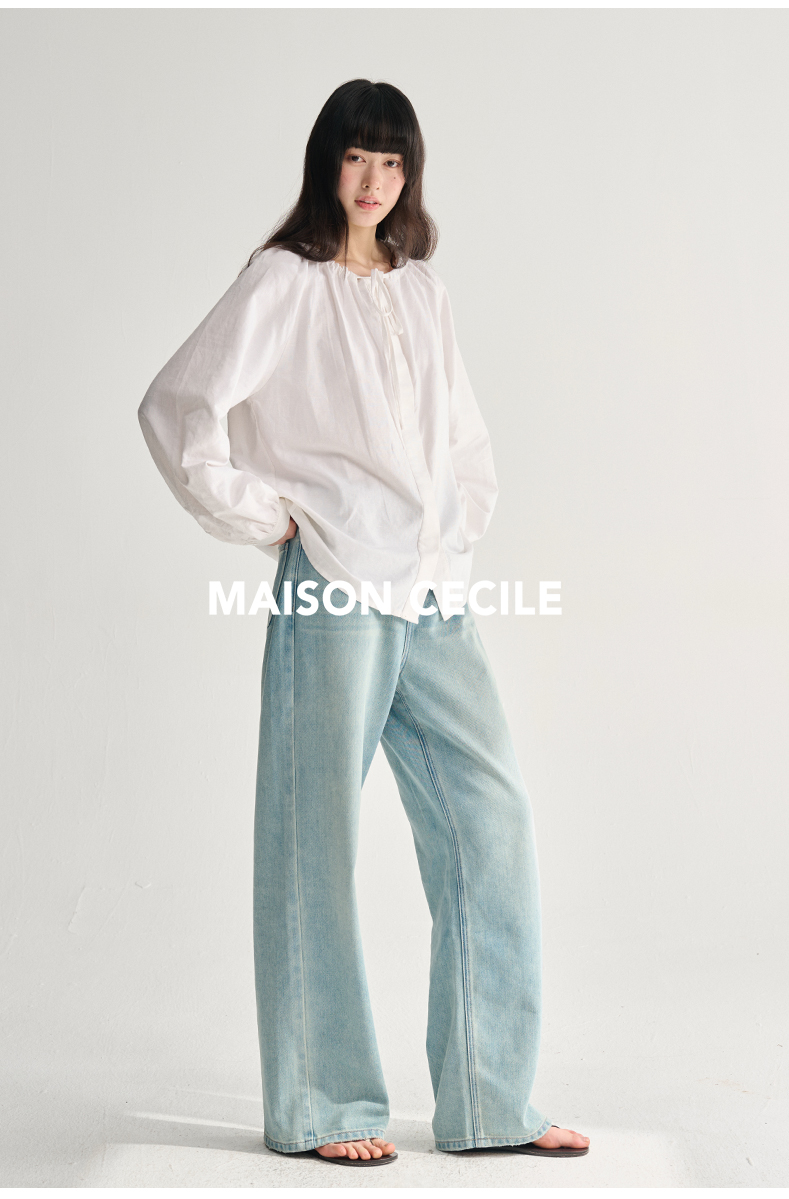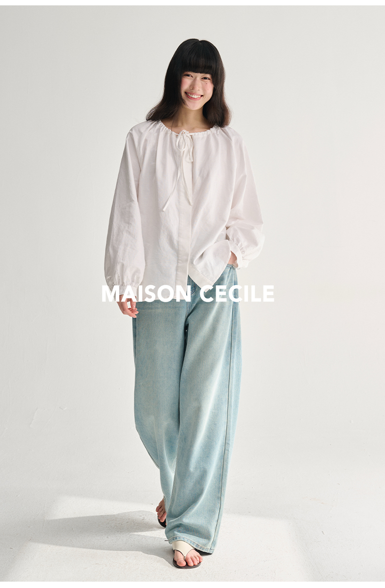 MAISON CECILE亚麻肌理感可调节抽绳圆领宽松简约白衬衫