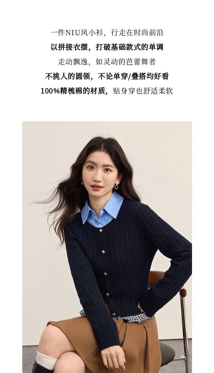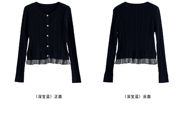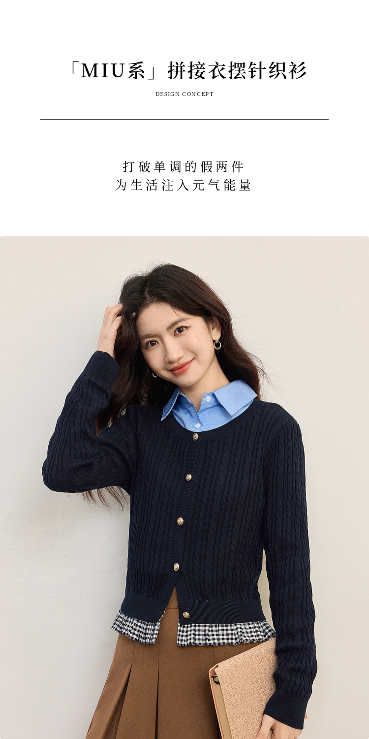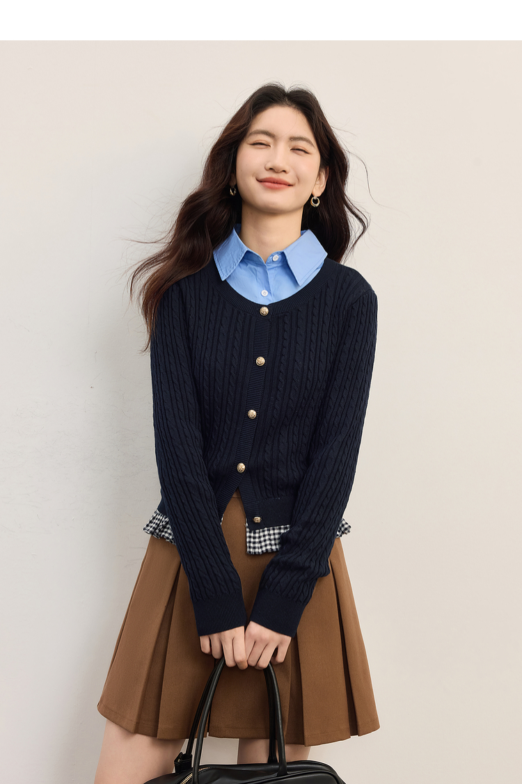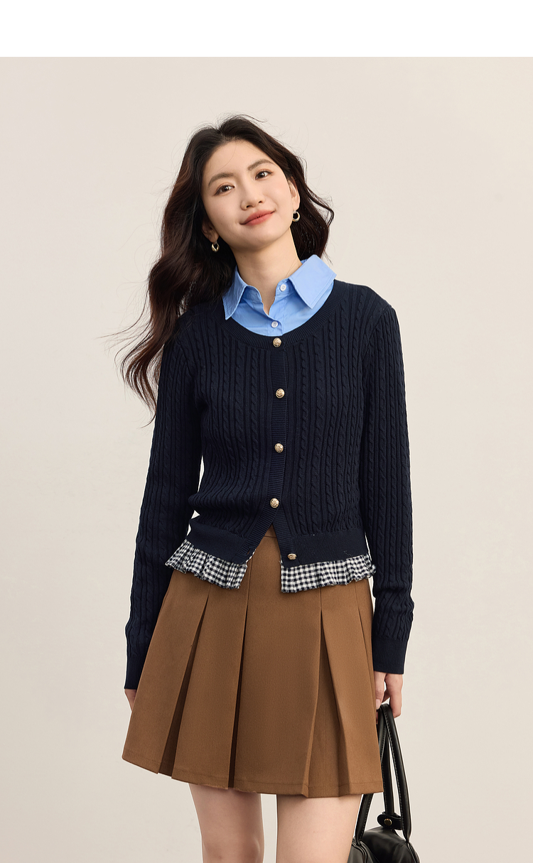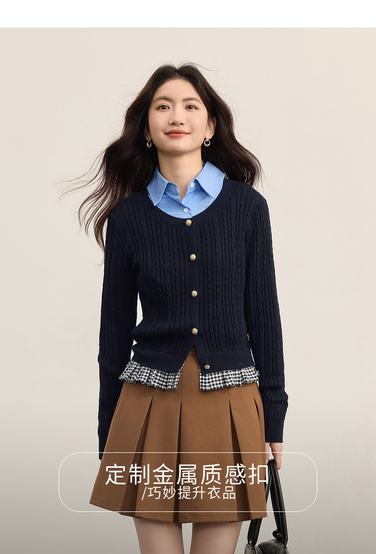 【周末秒杀】熙世界假两件麻花针织开衫女秋季2025新款设计感格子拼接短款上衣