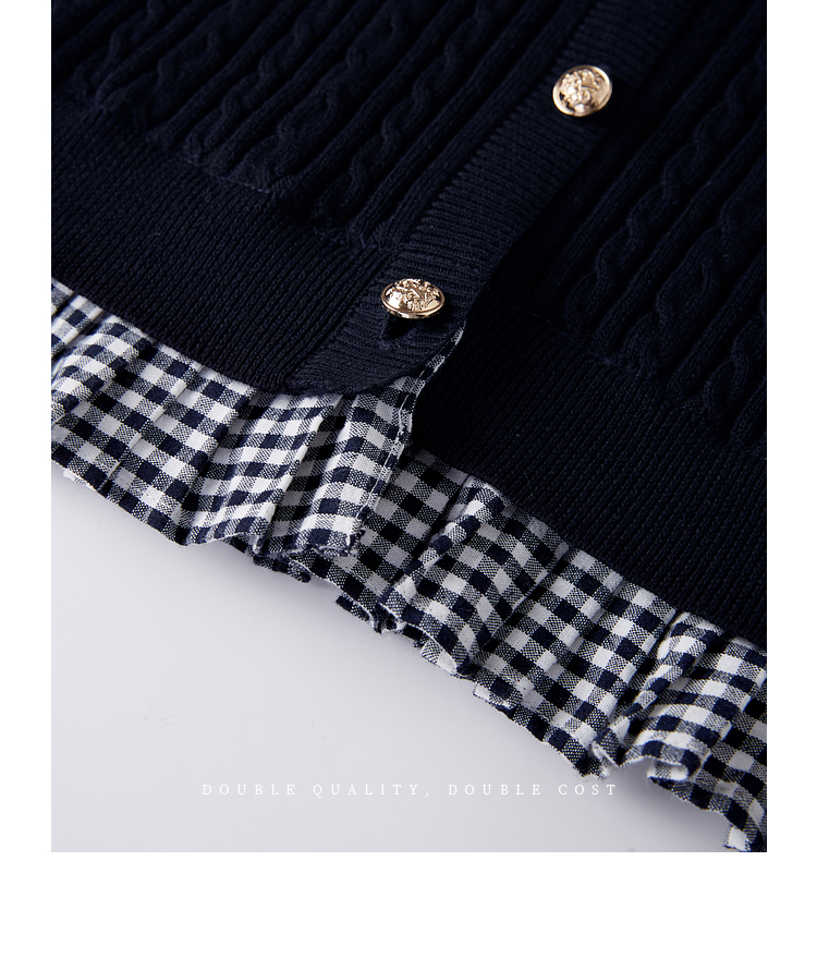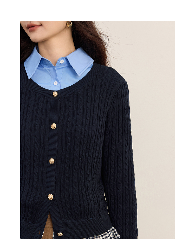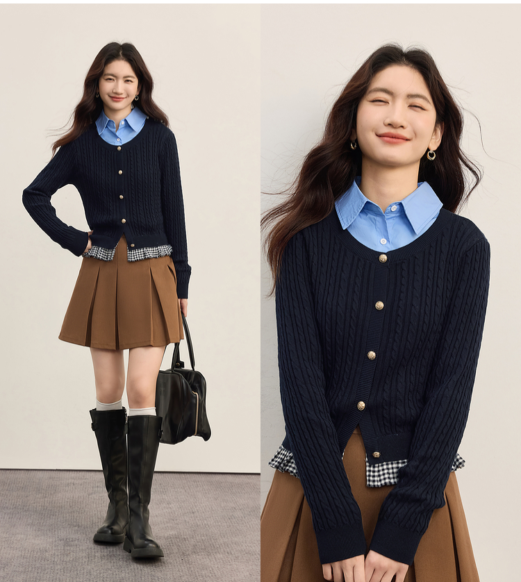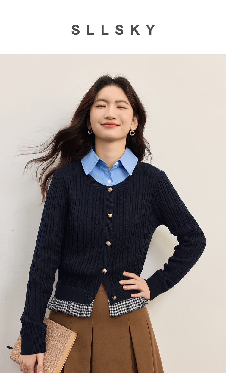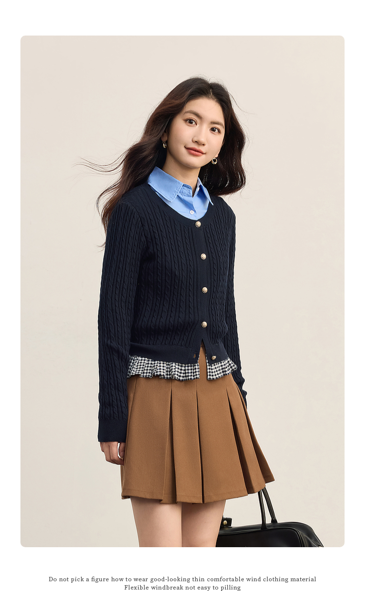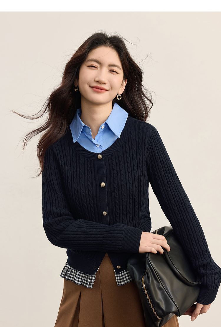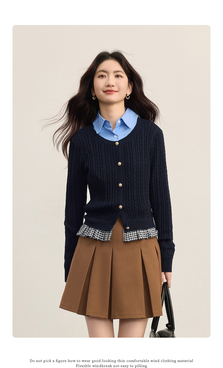 【周末秒杀】熙世界假两件麻花针织开衫女秋季2025新款设计感格子拼接短款上衣