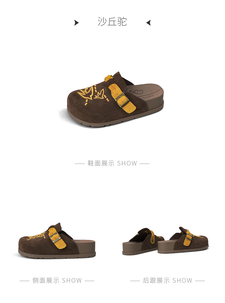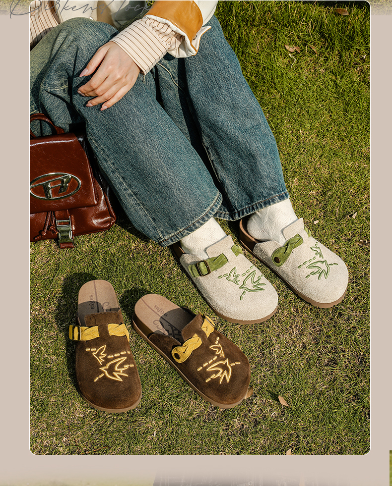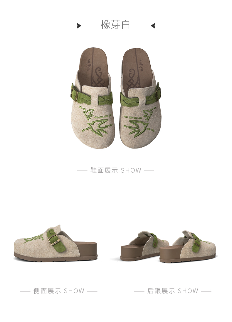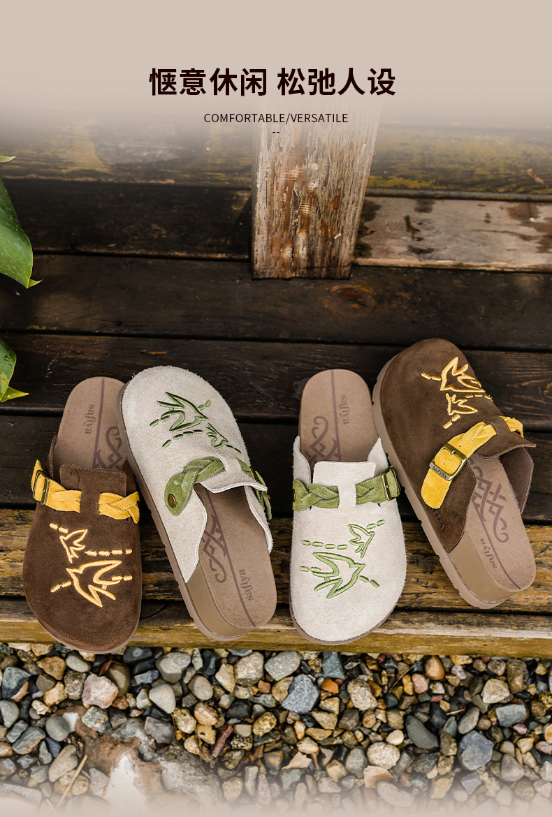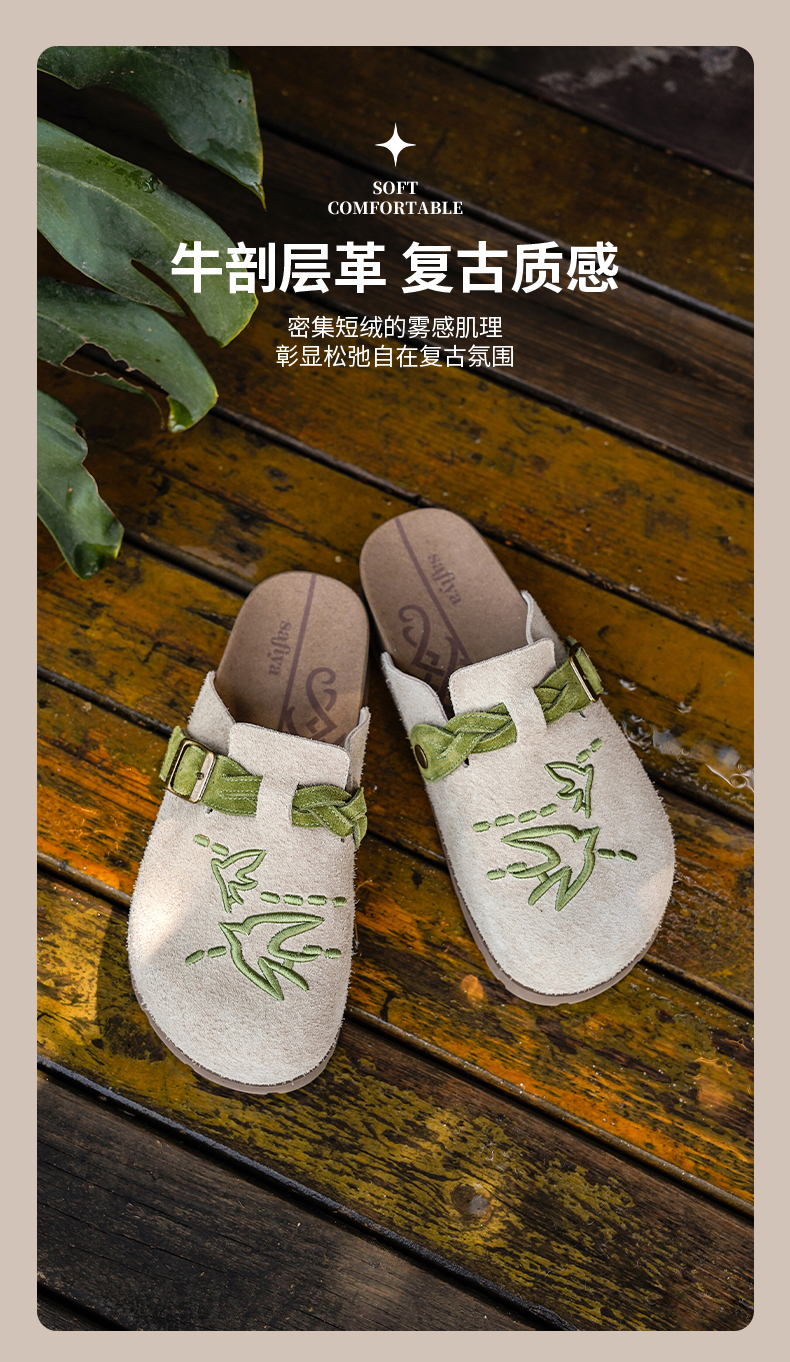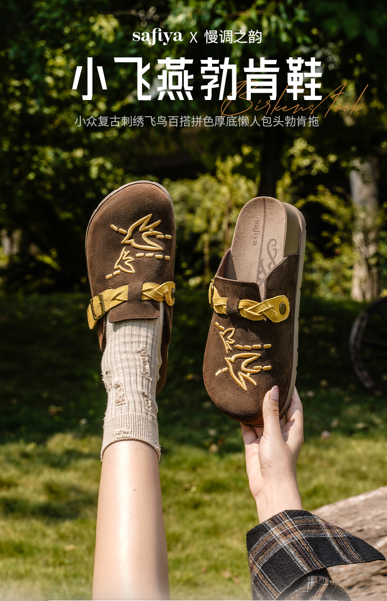 预售~Safiya/索菲娅2025小众复古刺绣飞鸟百搭拼色厚底懒人包头勃肯拖SFD3110150