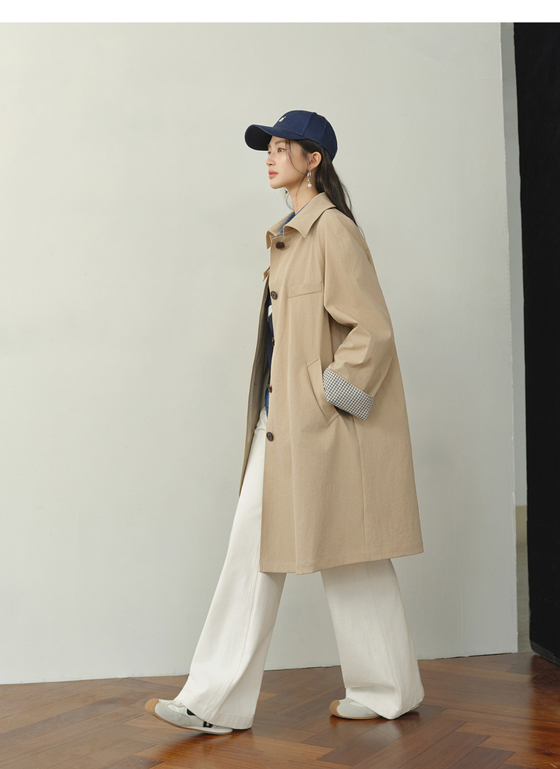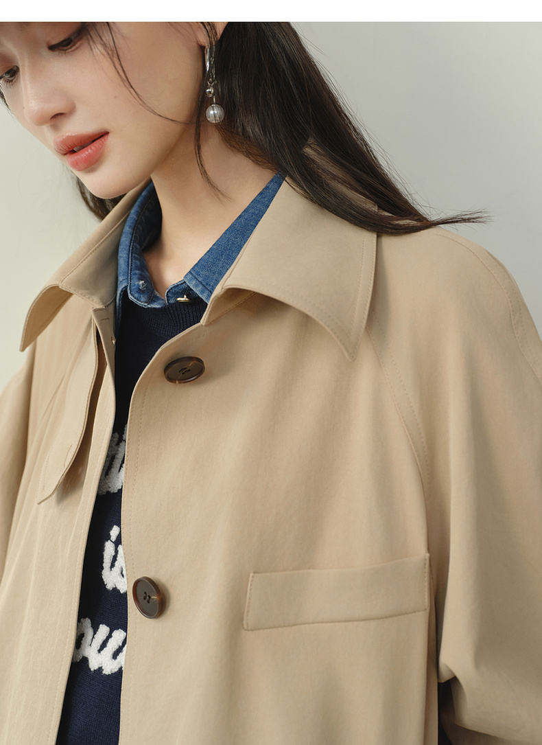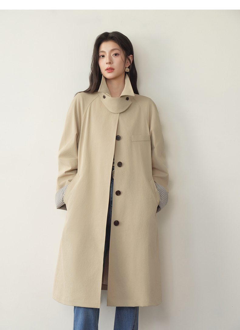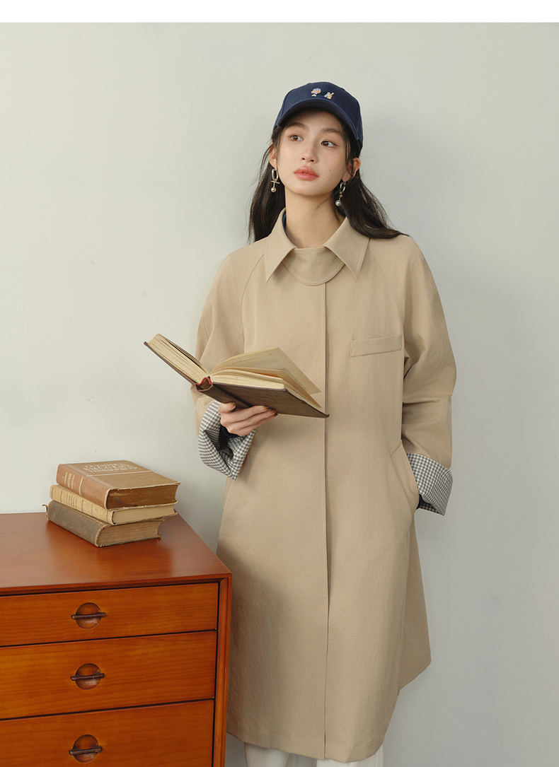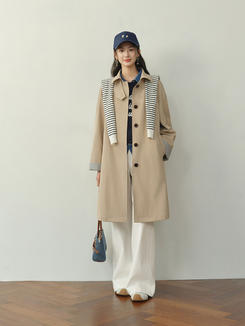 【严选】诗凡黎韩系格纹翻边通勤风衣2026春新款复古感翻领经典浅卡其外套7H1260171