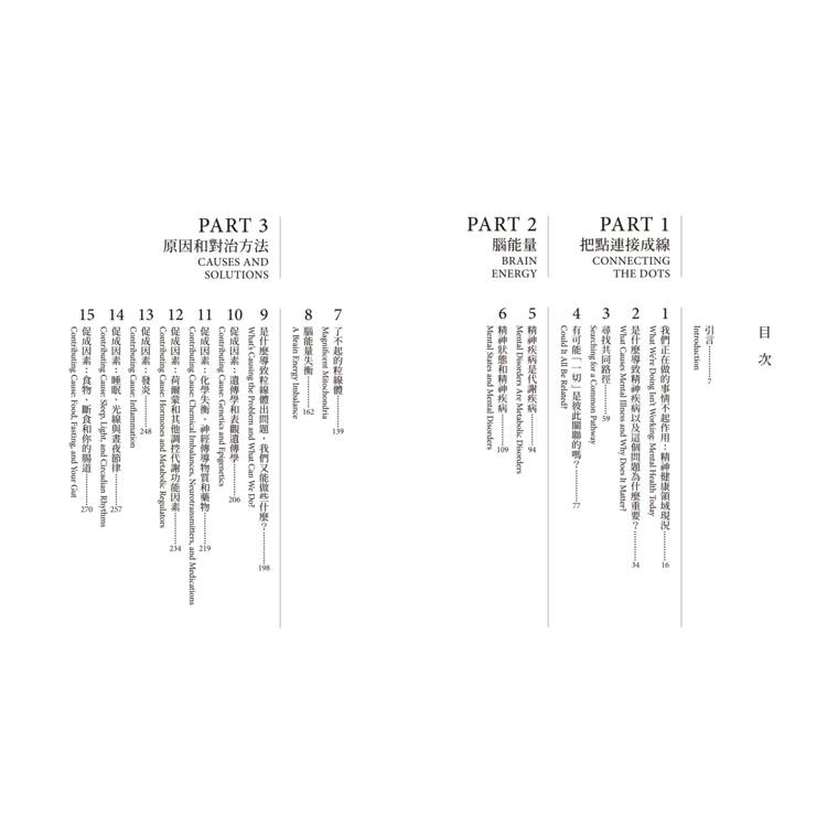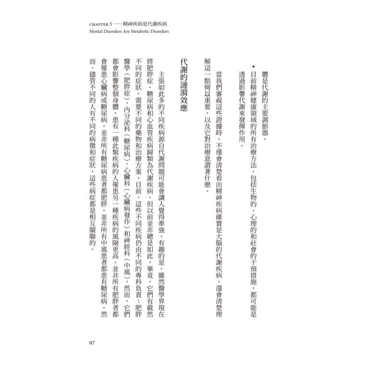 * 證據表明,目前精神健康領域的所有治療方法,包括生物的、心理的和社會的干預措施,都可能是透過影響代謝來發揮作用。基於這個新理解,讀者現在可以使用新的治療方法來促進長期康復,不再只是能指望減輕症狀。