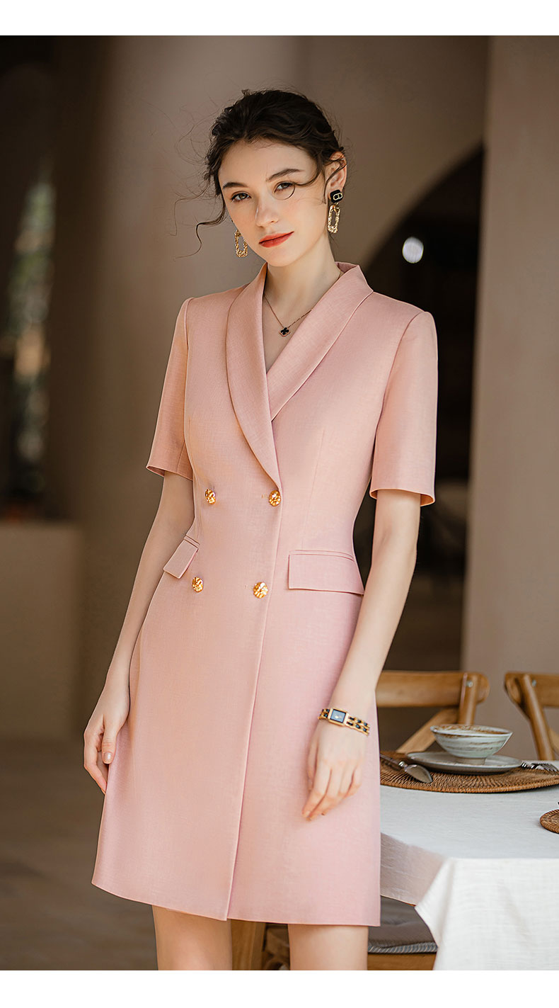 IWY/短袖粉色高级感连衣裙女职业主持人面试正装气质收腰西装裙Q920