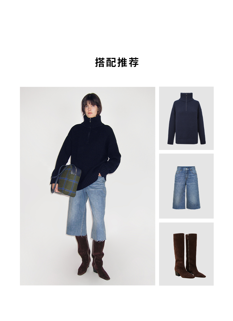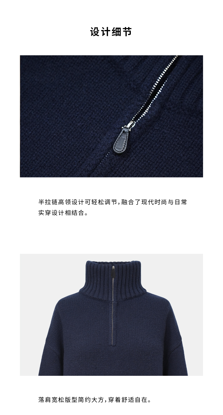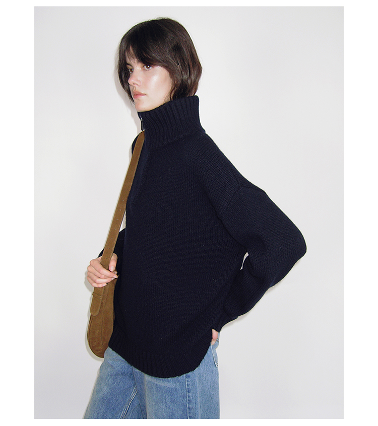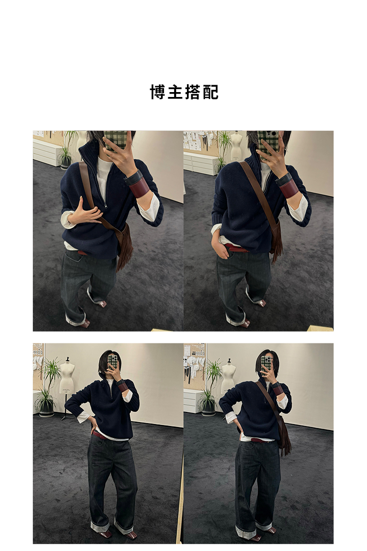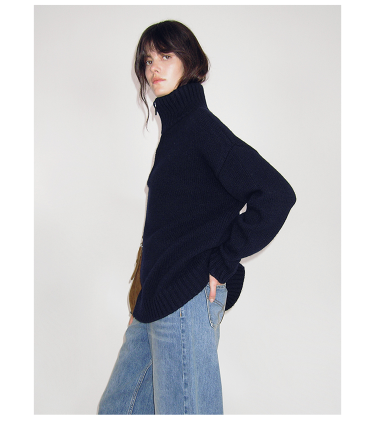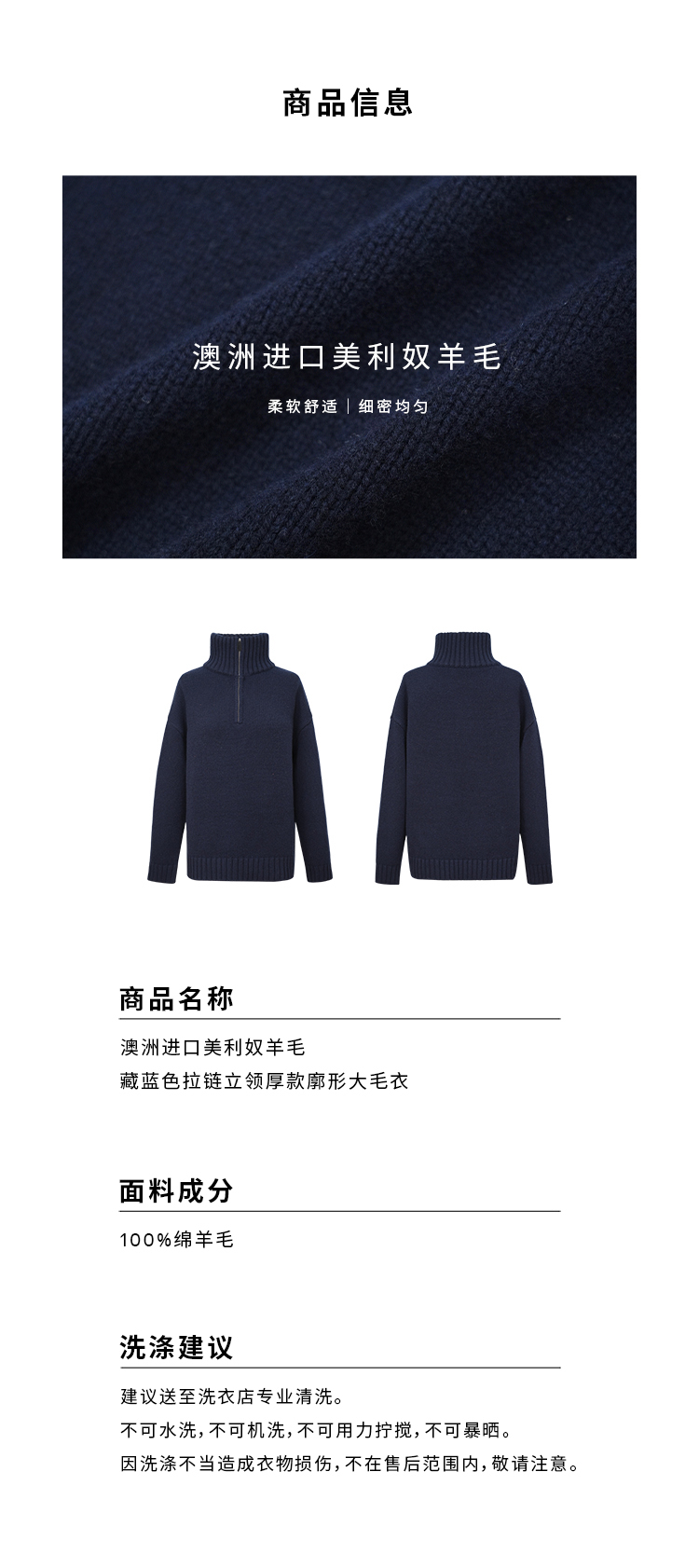 HIDEMI 澳洲进口美利奴羊毛藏蓝色拉链立领厚款廓形大毛衣