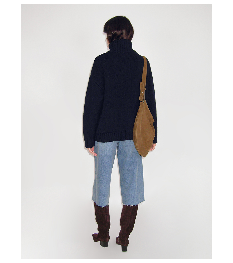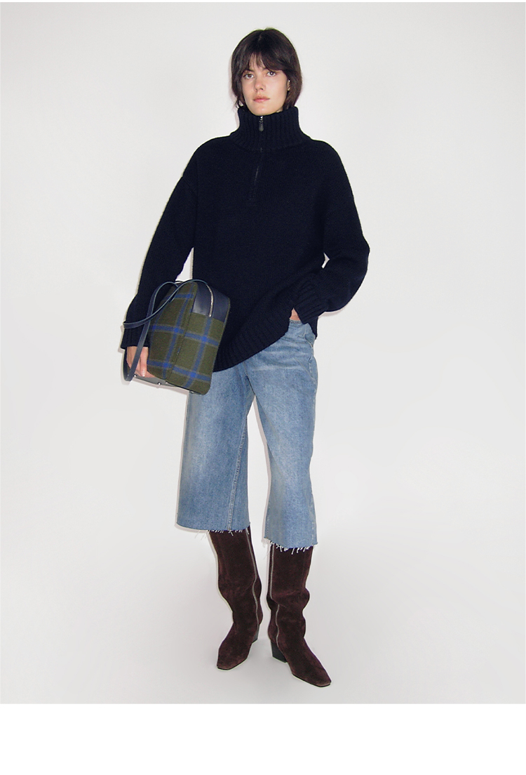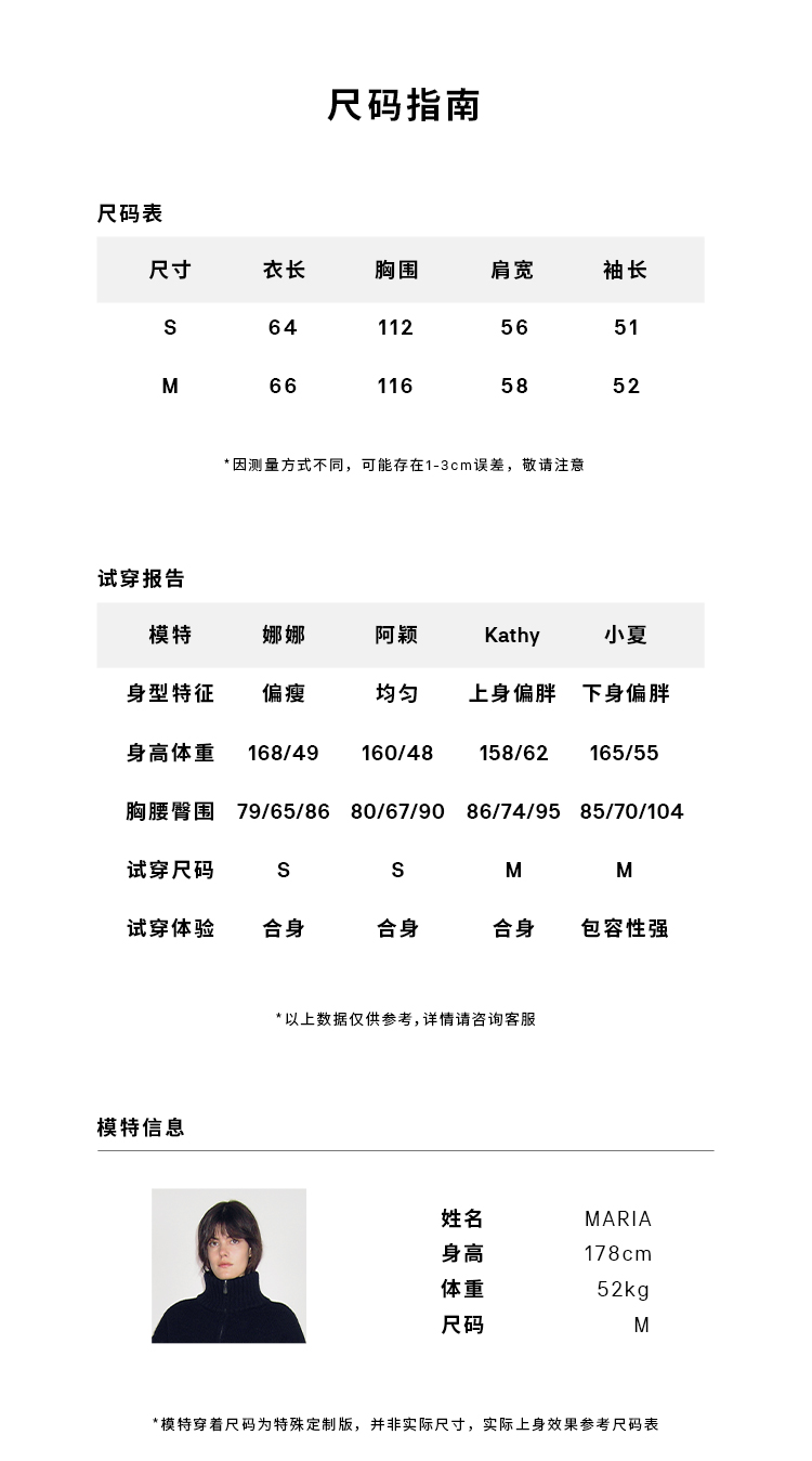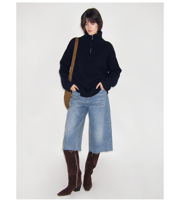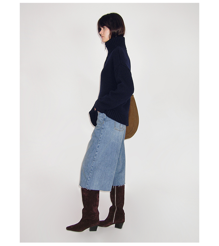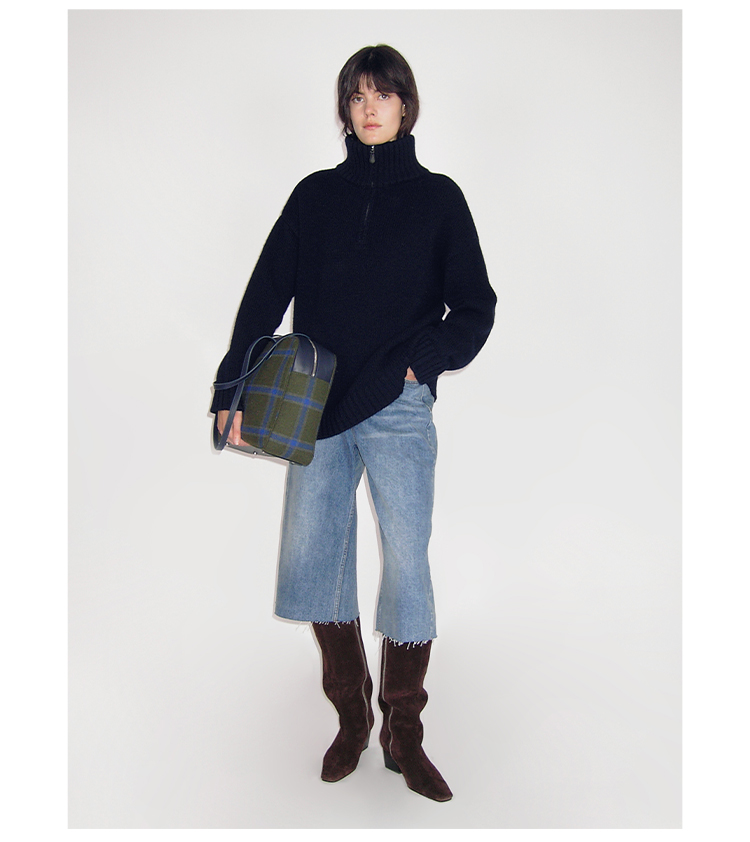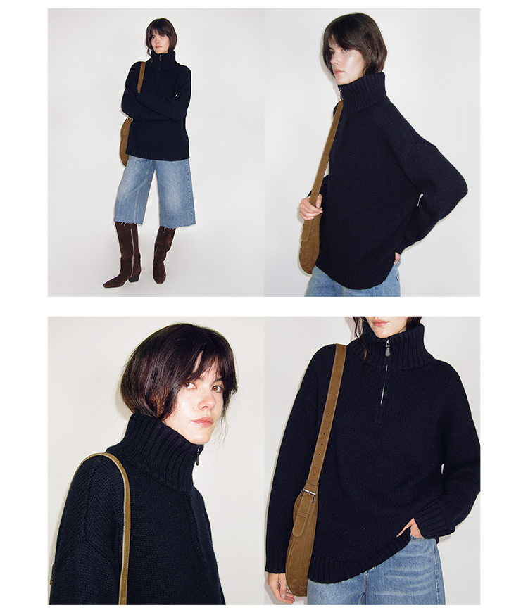 HIDEMI 澳洲进口美利奴羊毛藏蓝色拉链立领厚款廓形大毛衣