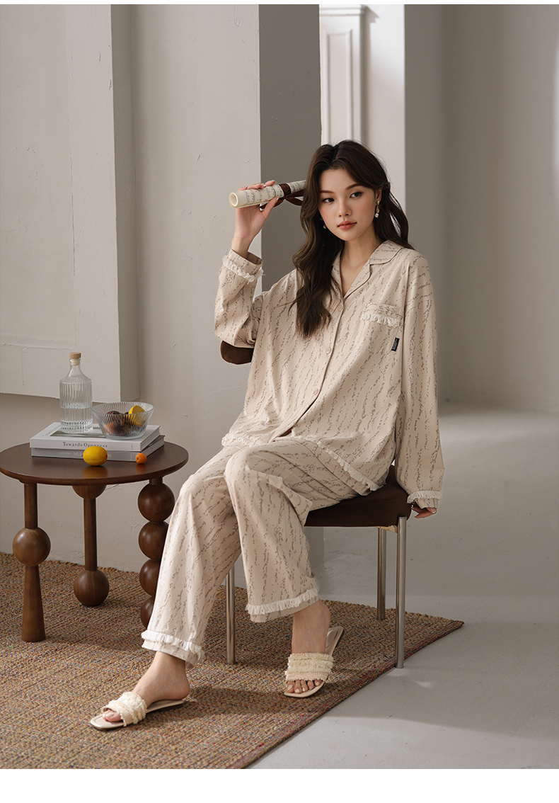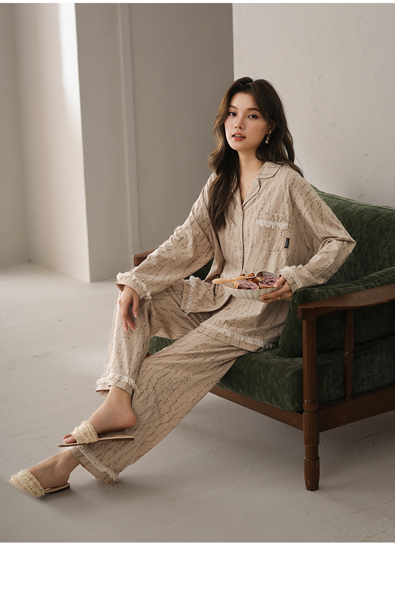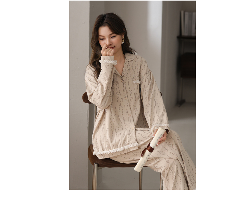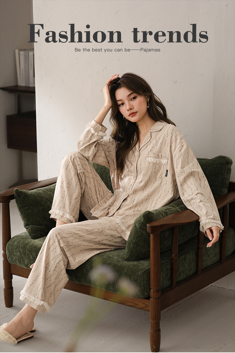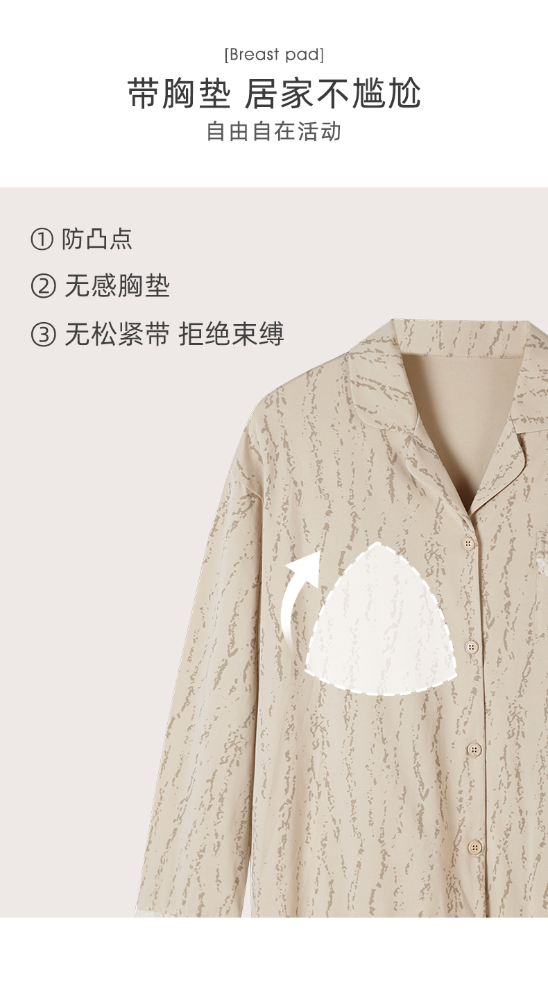 可人儿春秋季带胸垫奥力棉女士长袖长裤睡衣可外出纯棉家居服套装