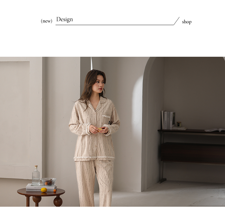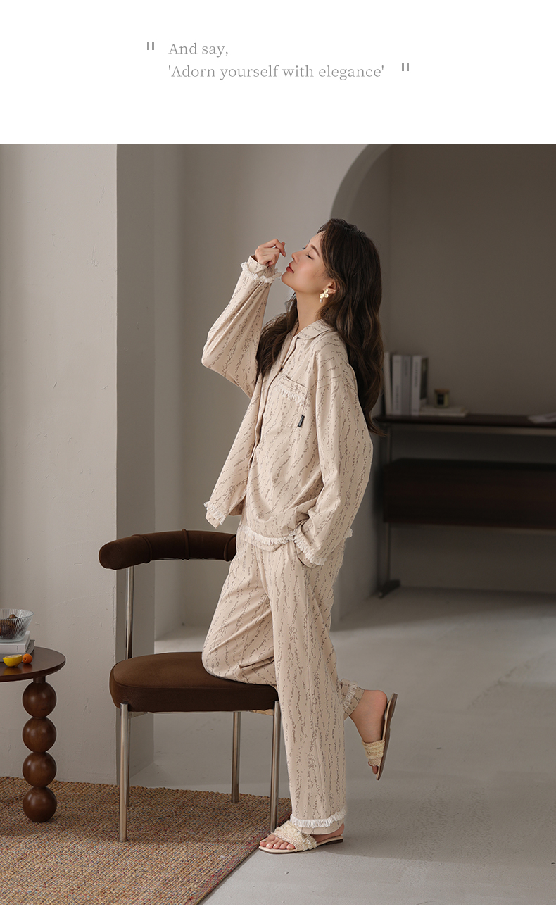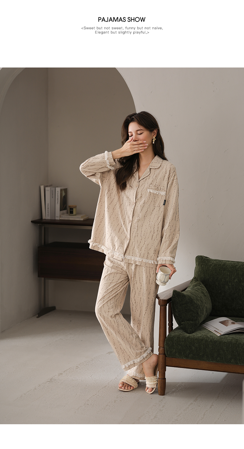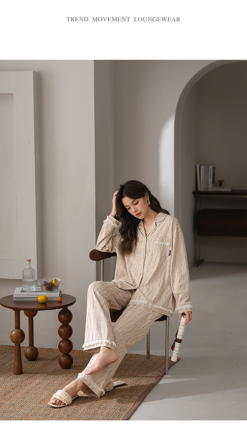 可人儿春秋季带胸垫奥力棉女士长袖长裤睡衣可外出纯棉家居服套装