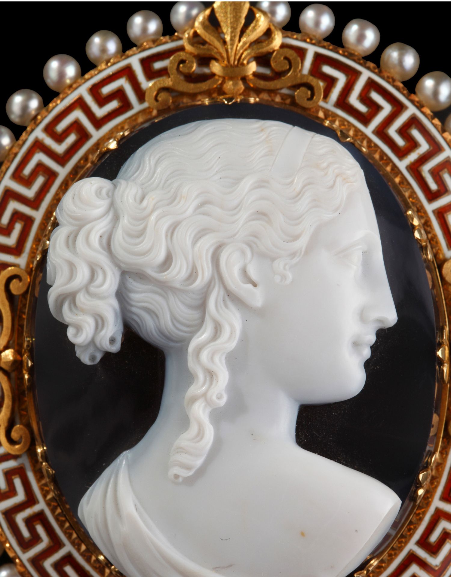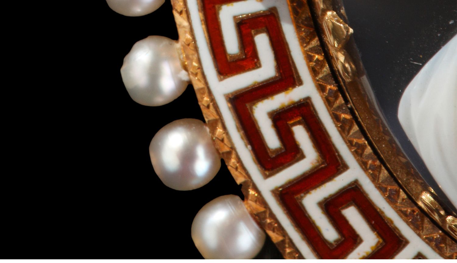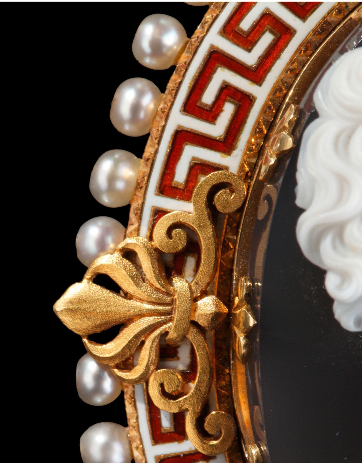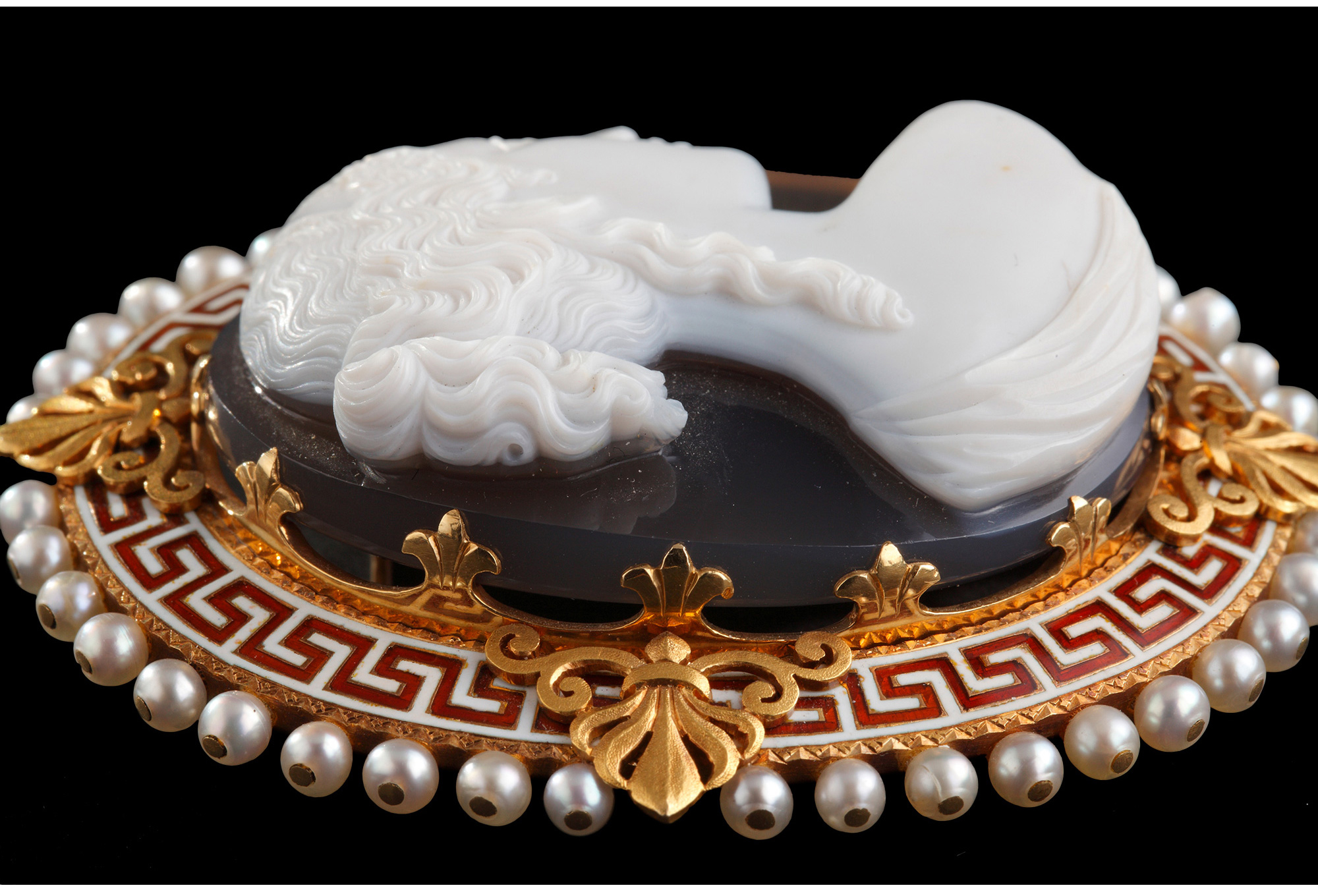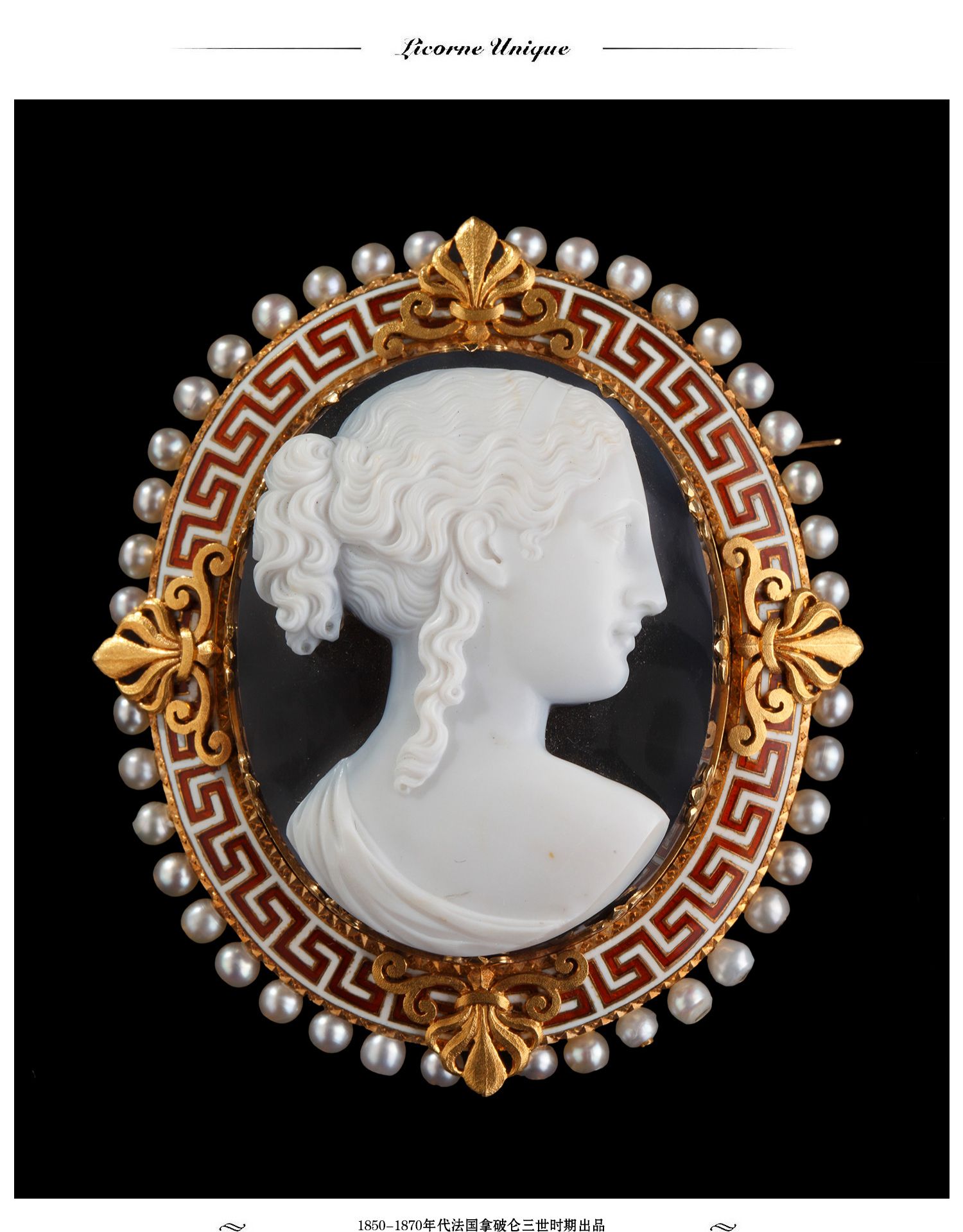 独角鹿西洋古董珠宝18K金镶野生珍珠珐琅Cameo卡梅奥玛瑙浮雕胸针