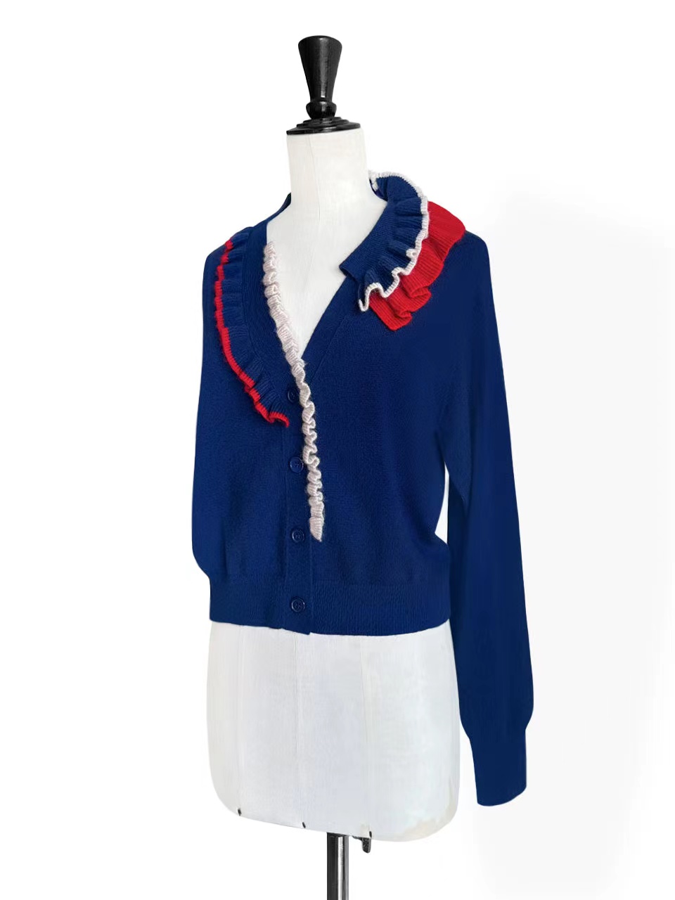 TYNVIE 撞色荷叶边装饰羊绒开衫- 蓝色