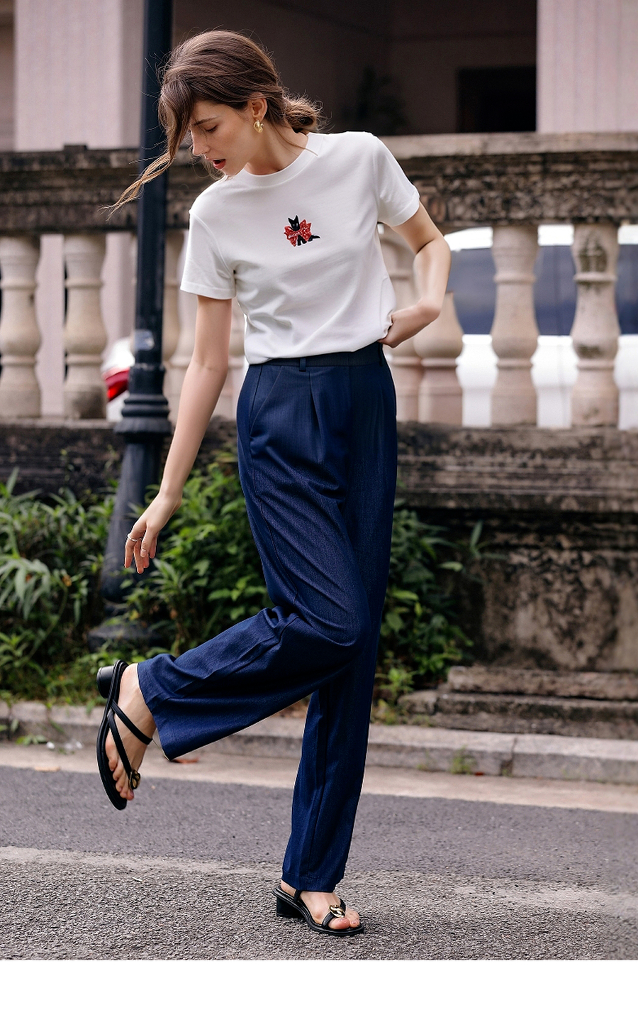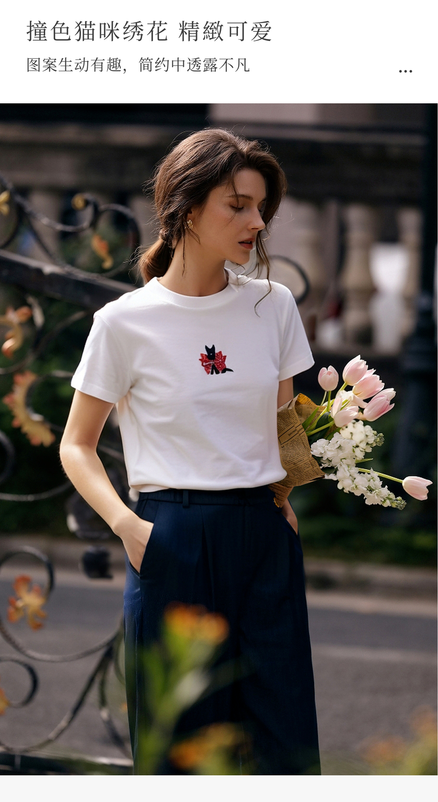 OLrain欧芮儿撞色猫咪绣花百搭白色T恤2025夏季新款休闲短袖上衣