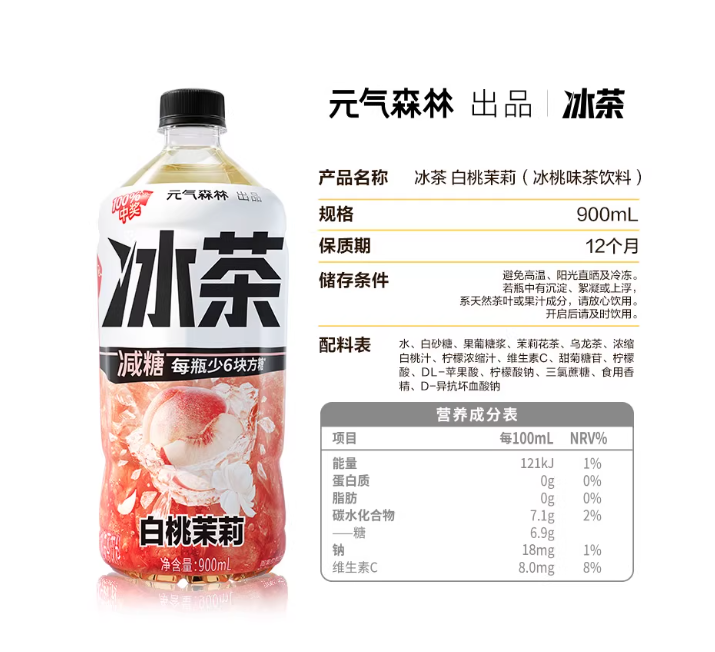 900ml 元气森林 白桃茉莉冰桃味茶饮料 减糖茶饮料饮品