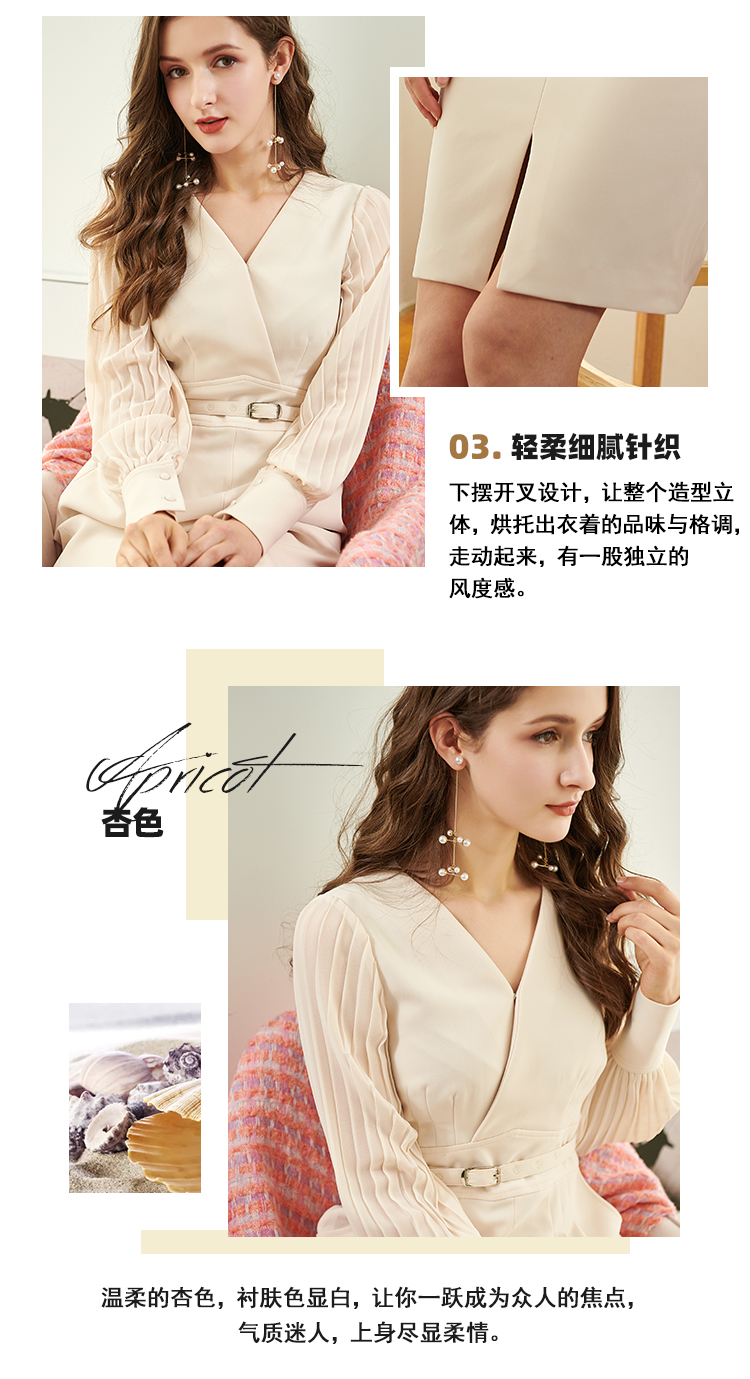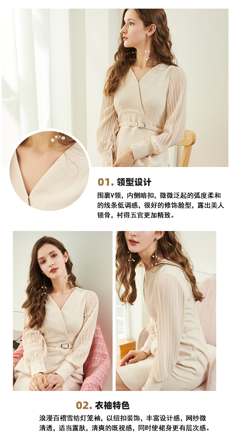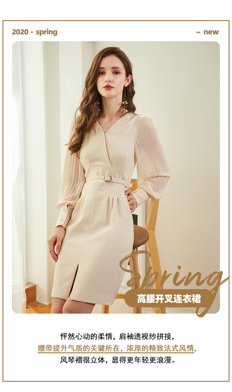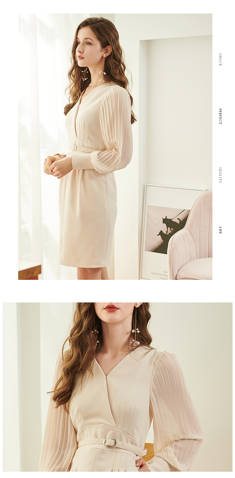 欧芮儿新款长袖V领雪纺连衣裙中长款显瘦气质收腰包臀裙